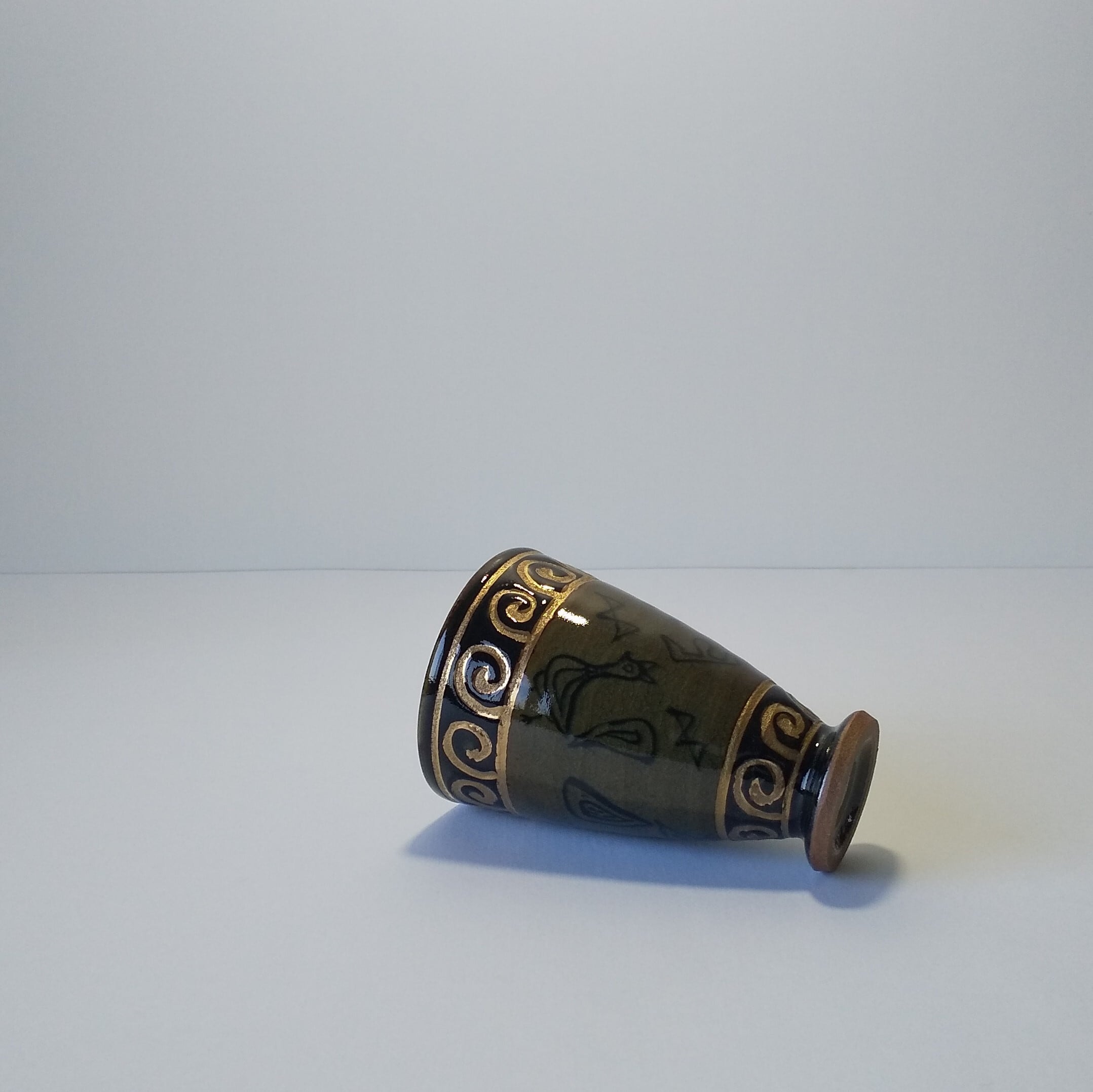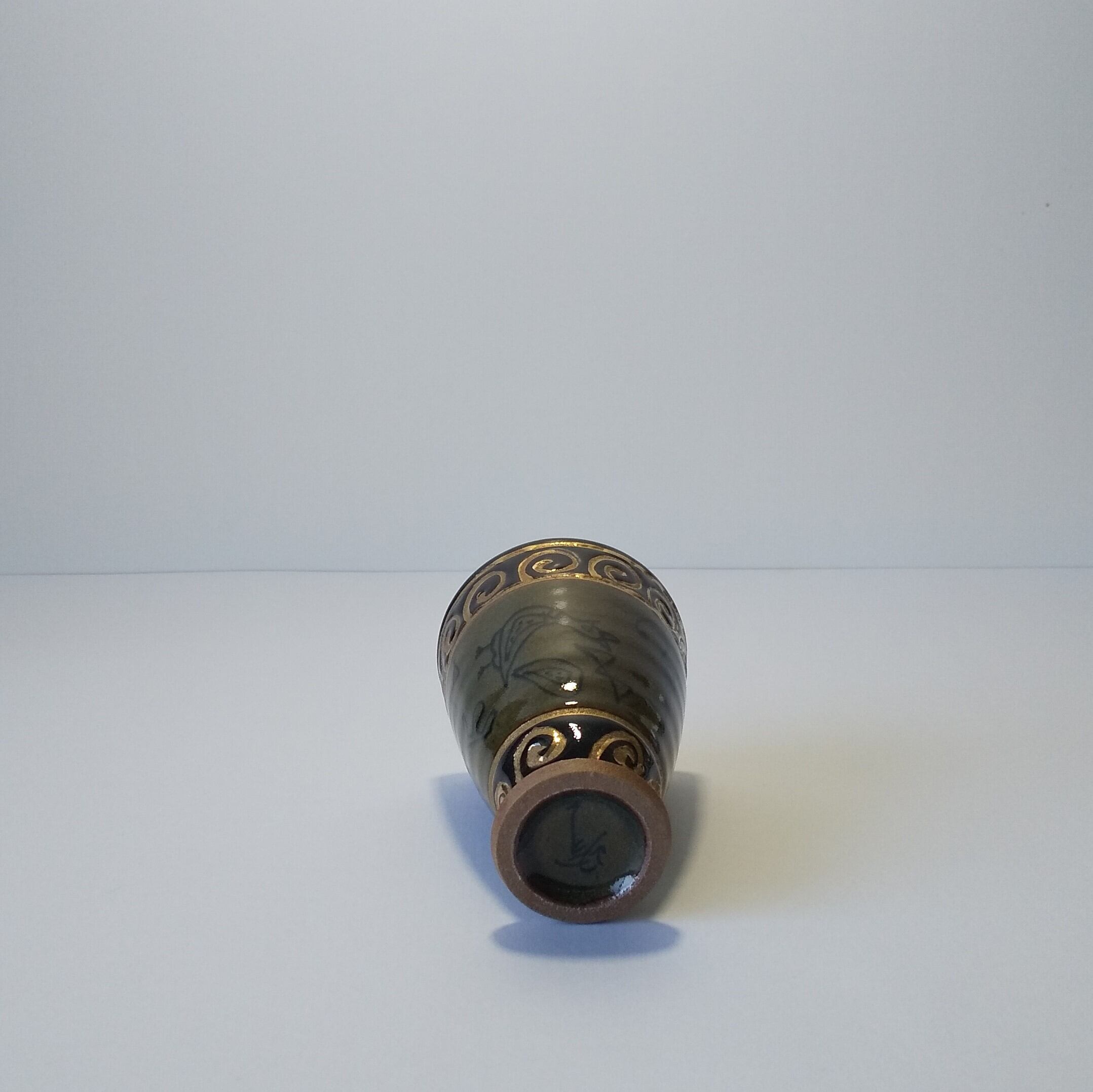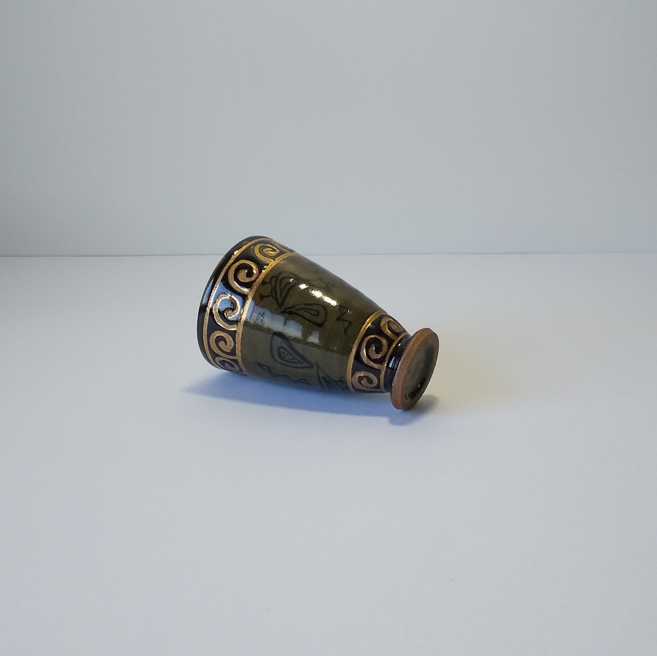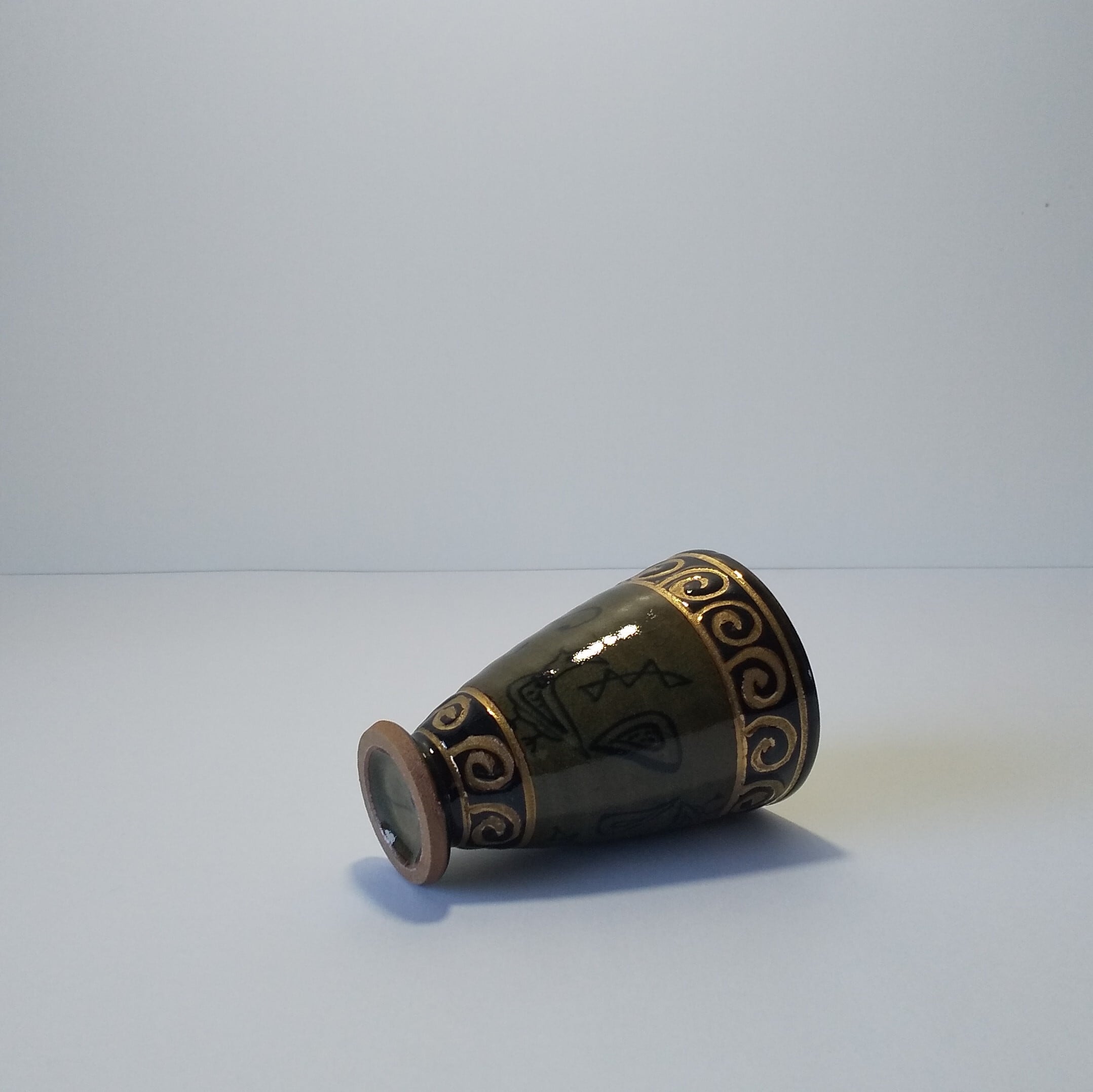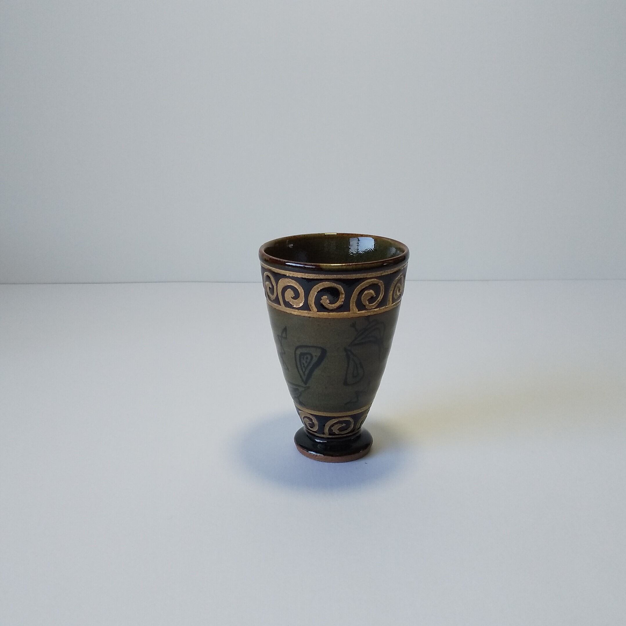 w7.5xh11㎝濃ゆい青磁(茶に近い)手造りで上と下に金色で濃んであります、 容量180ml、電子レンジ不可