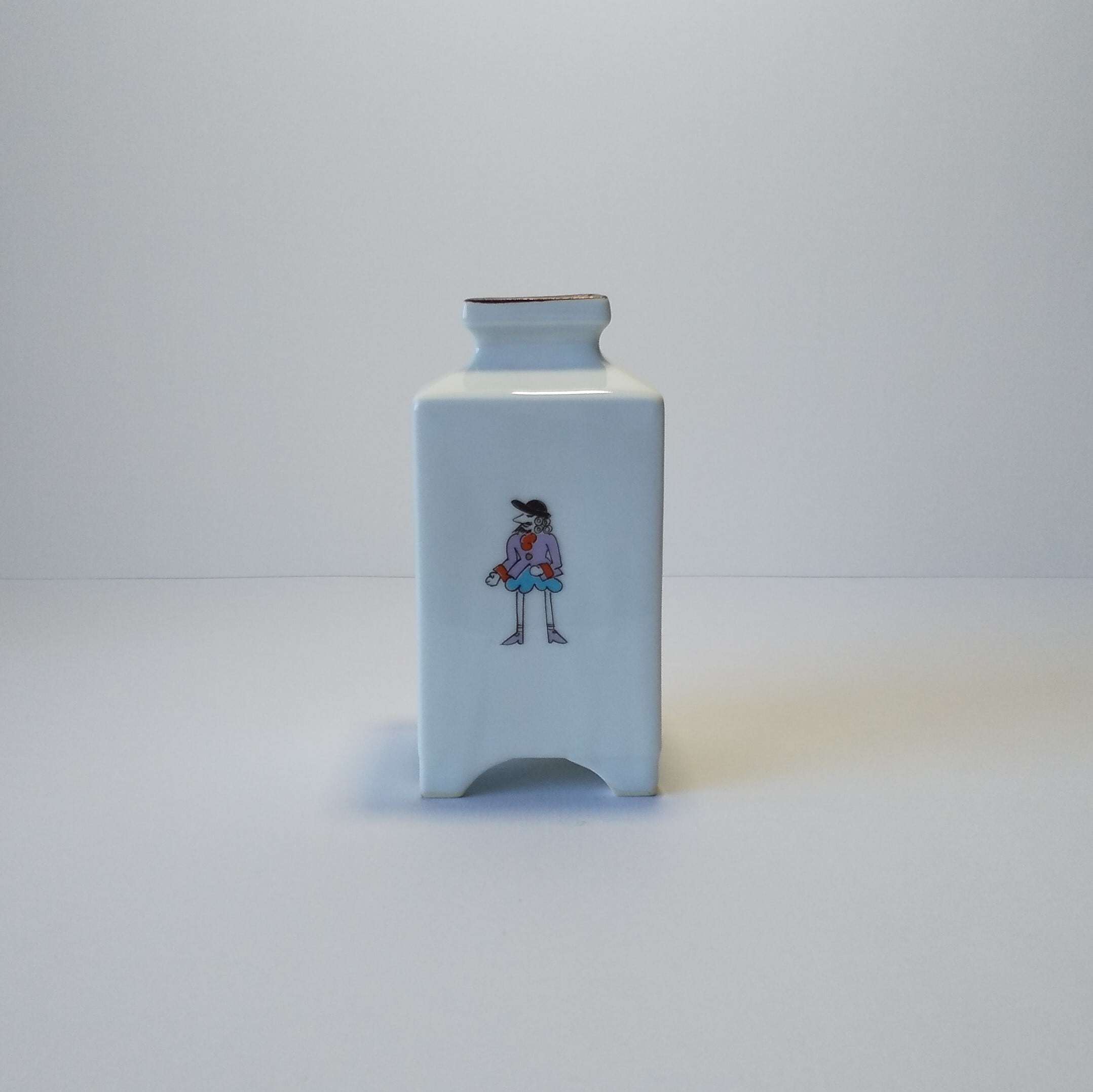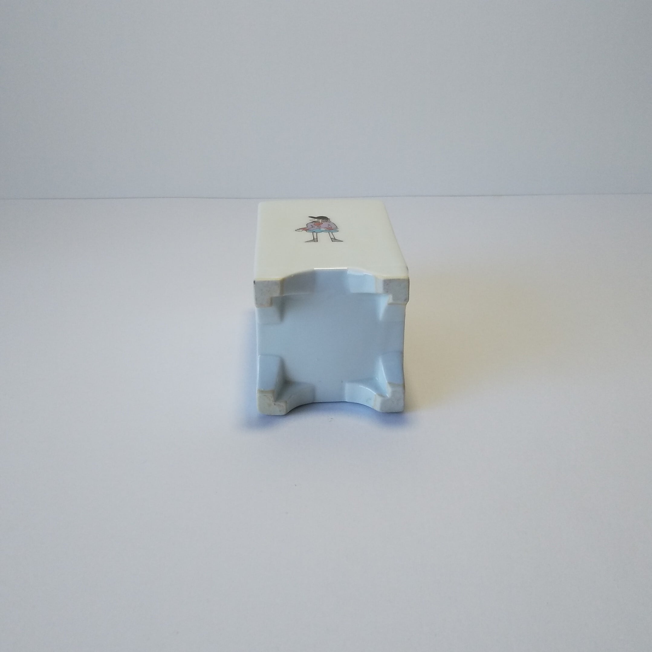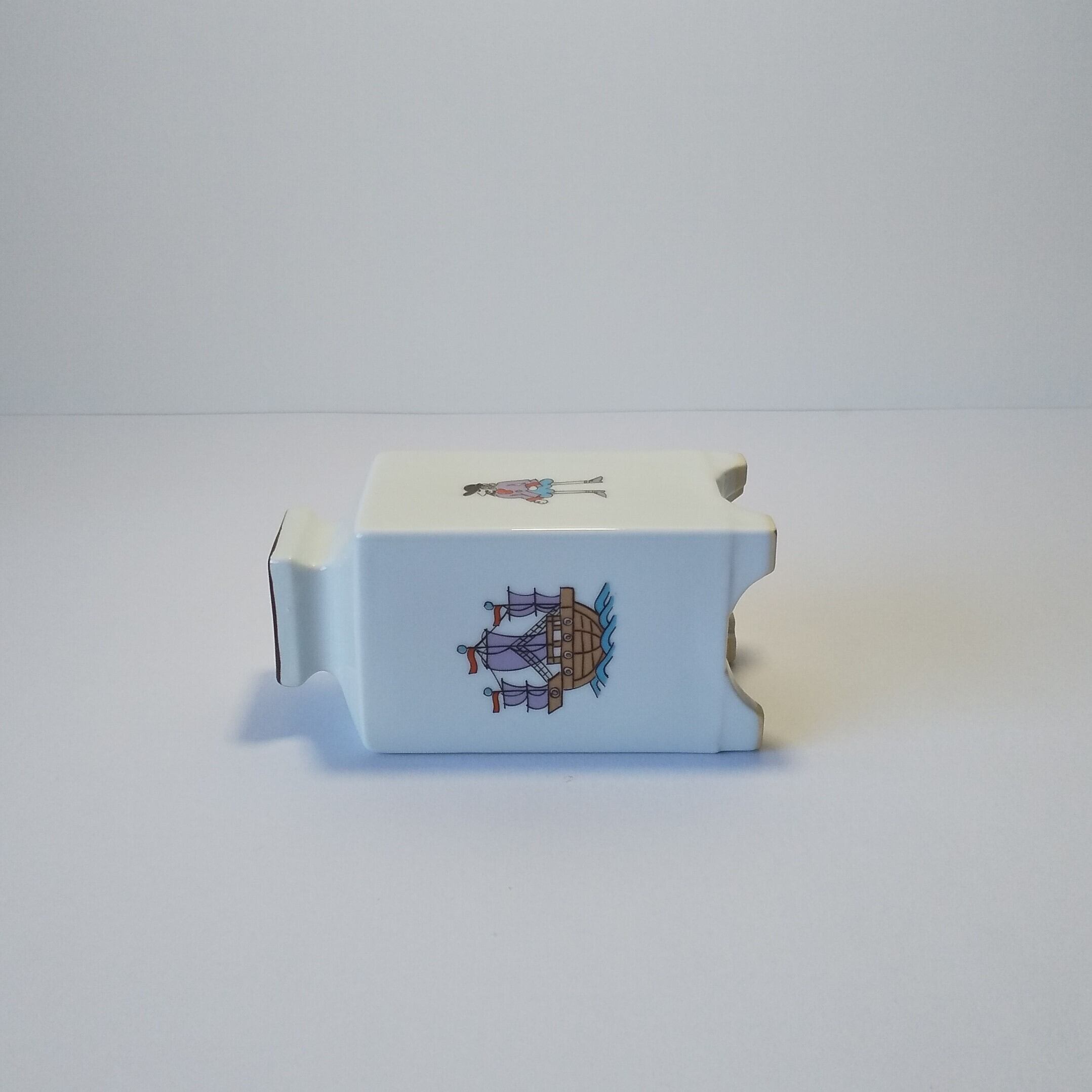 w7.2xH15㎝ 四つ足で白磁に南蛮船、異人絵描いてあります、渕錆で四ヶ所に南蛮船、異人絵を 交互に描いてあり、足は四つ足で安定しています。インテリアとして、白磁ですから花器としても映えると思います