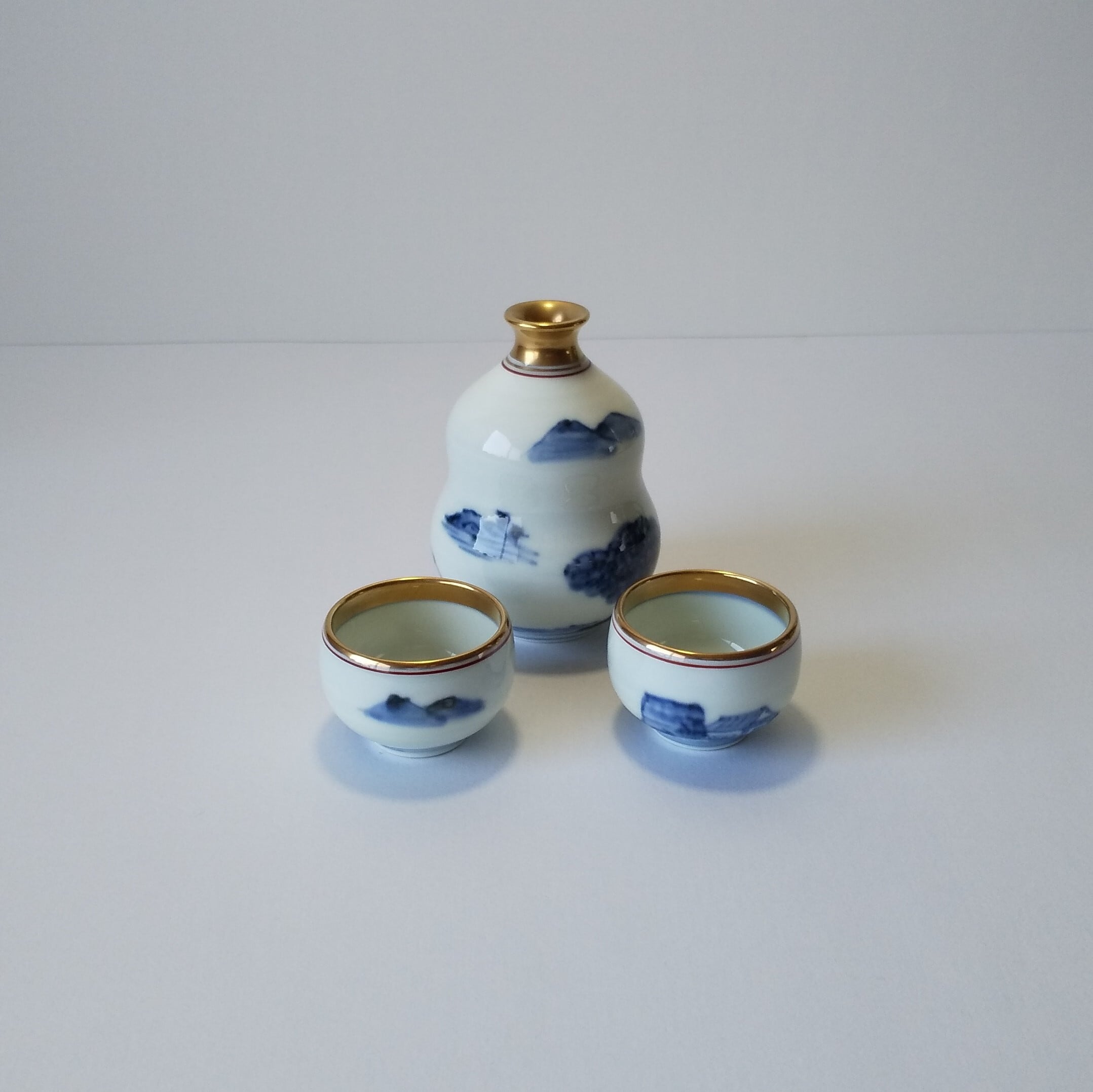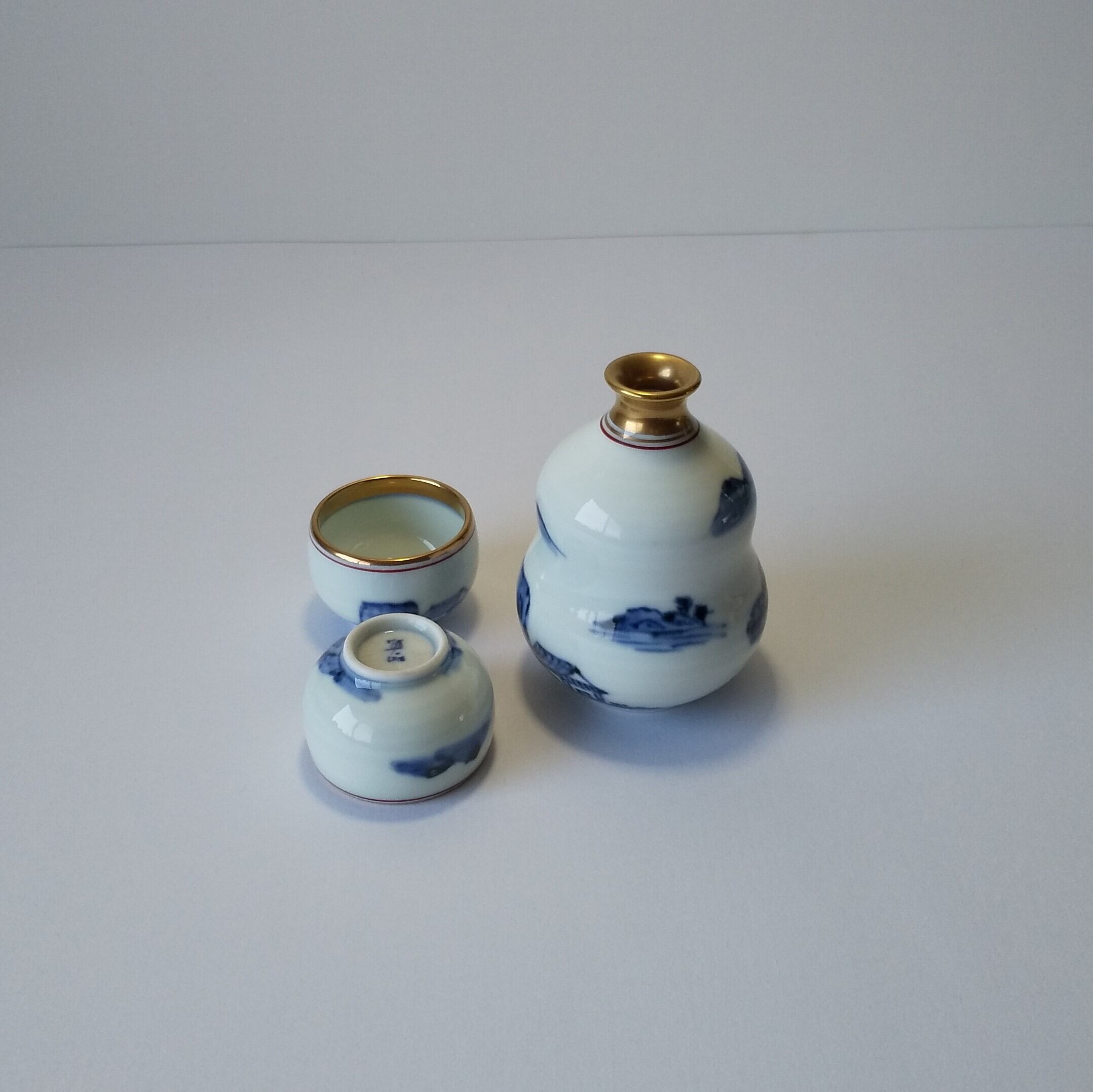 瓢形うす青磁の地肌に手描きで山水絵、描いてあります口部の金色は良い金使ってあります 盃の口部も内側まで金色してあります、盃は丸ぐい吞みで少し大きめ 徳利一本、盃2個のセットです 容量 徳利190ml 盃30ml 金色使用の為電子レンジ不可