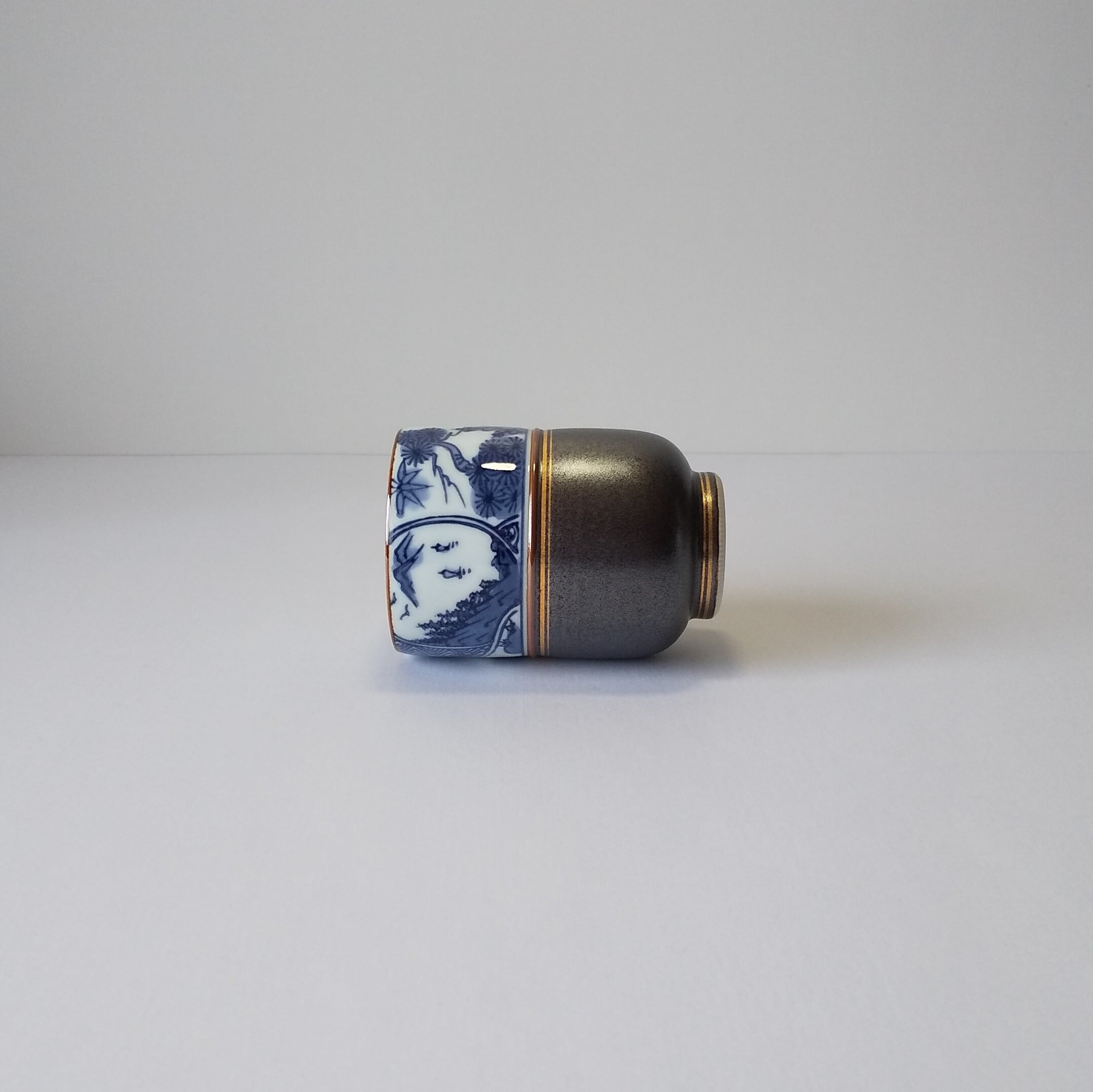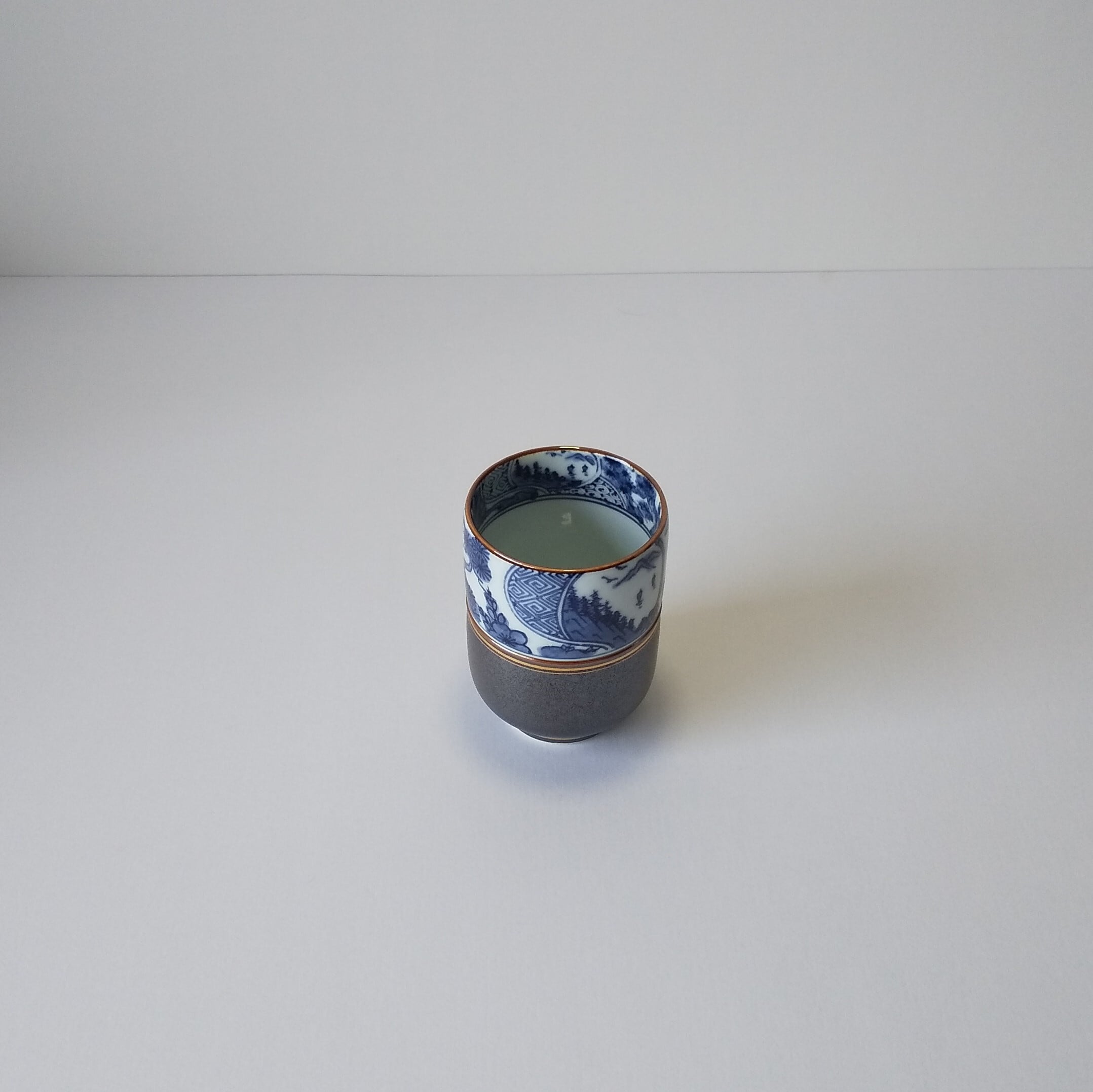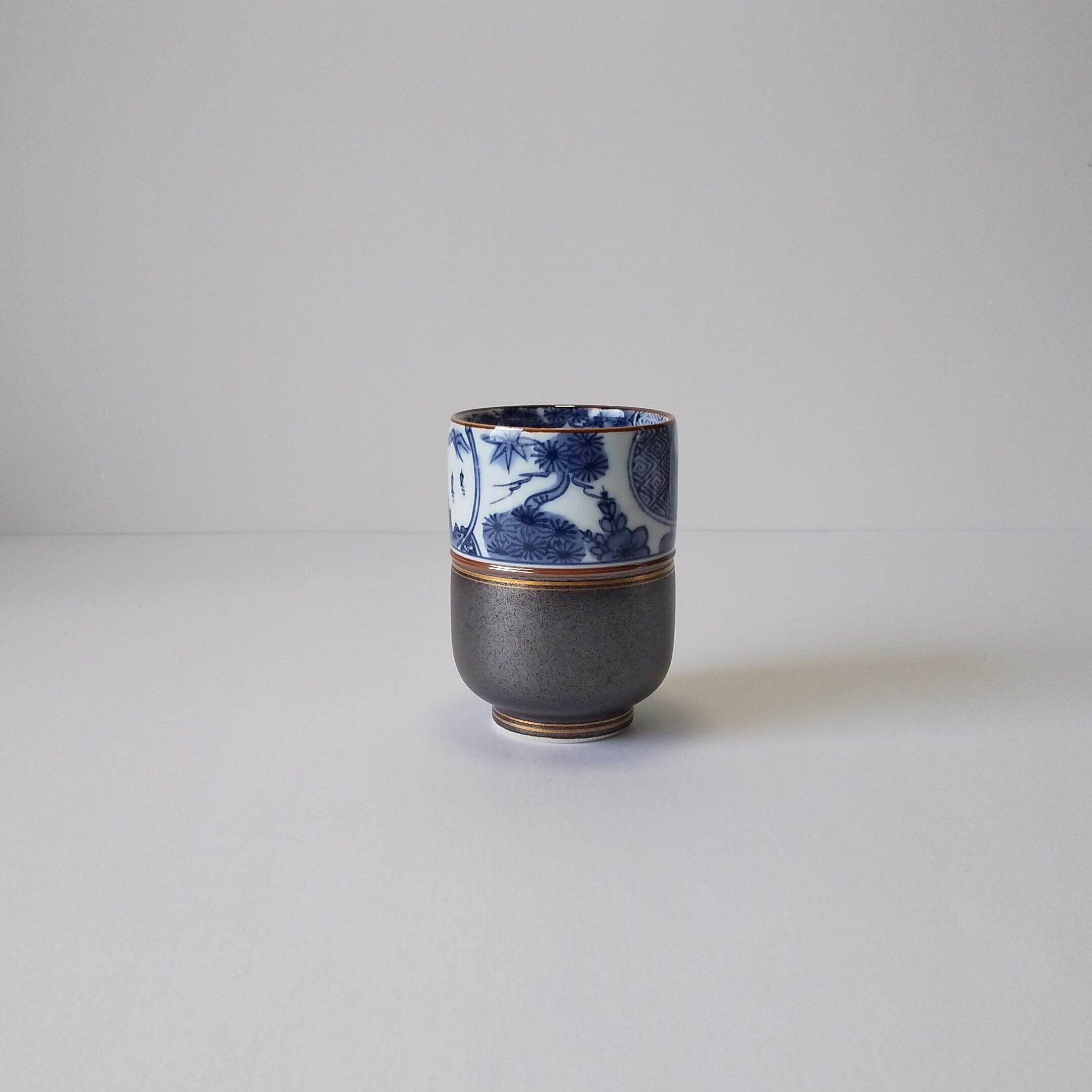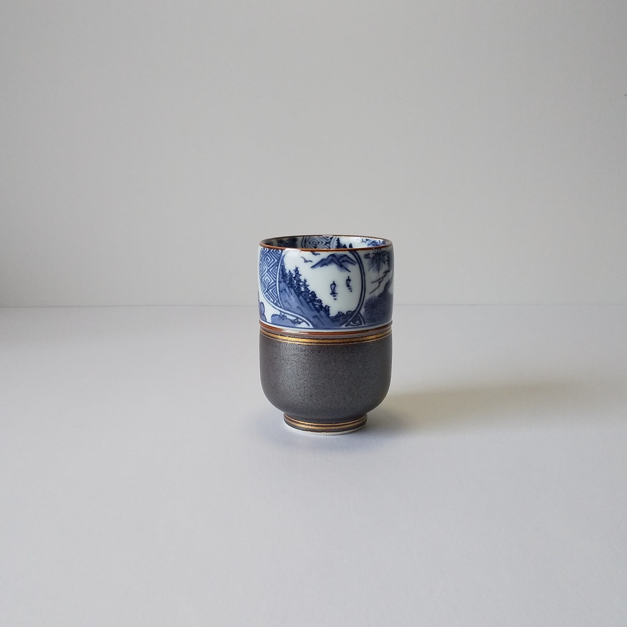 6.7xH9.6㎝ 容量八分目入れた状態で180ml 染付山水松梅絵、外側腰から下錆塗り、内側渕から2㎝位まで山水絵柄入り 落ちついた雰囲気の湯吞です 金筋を入れてありますから レンジx