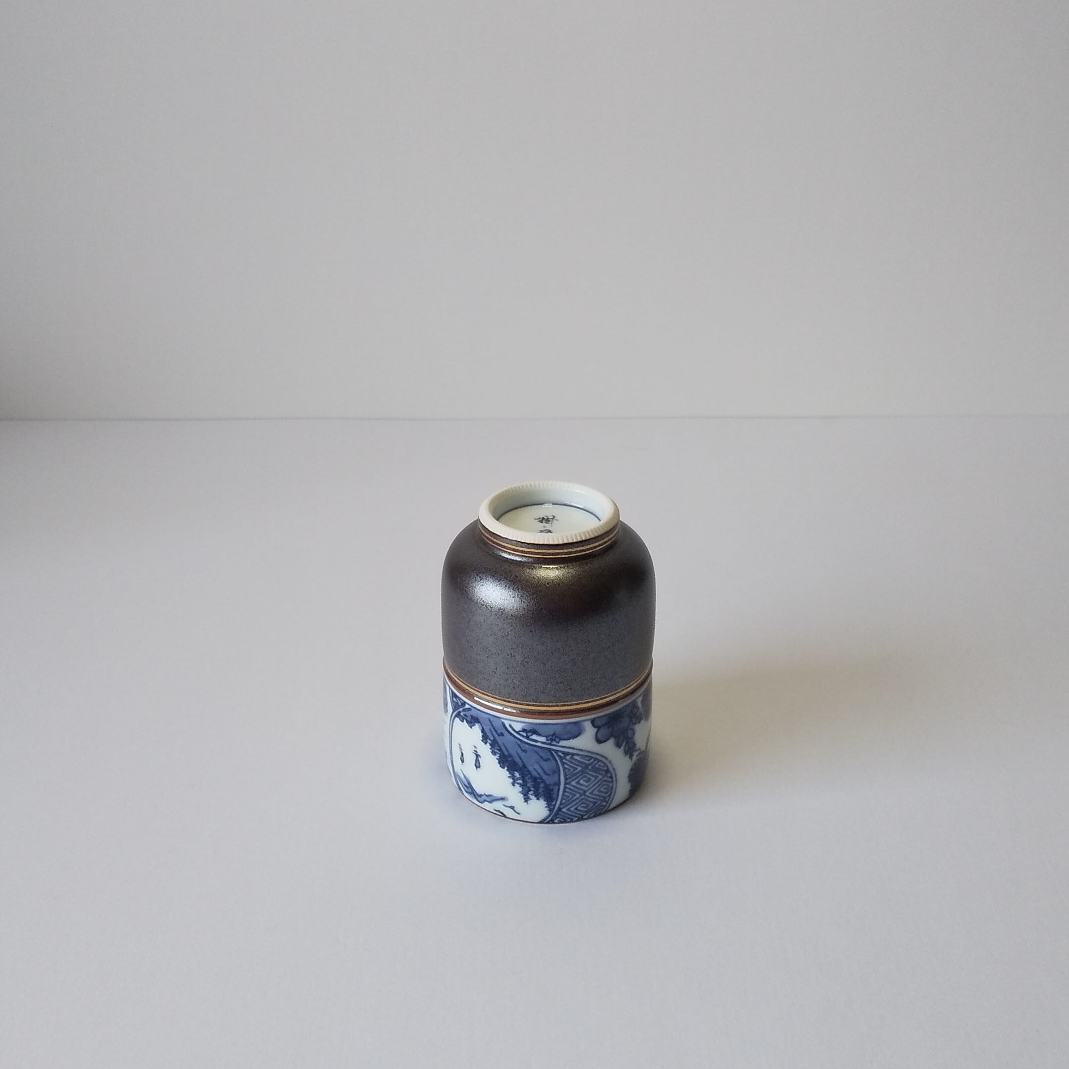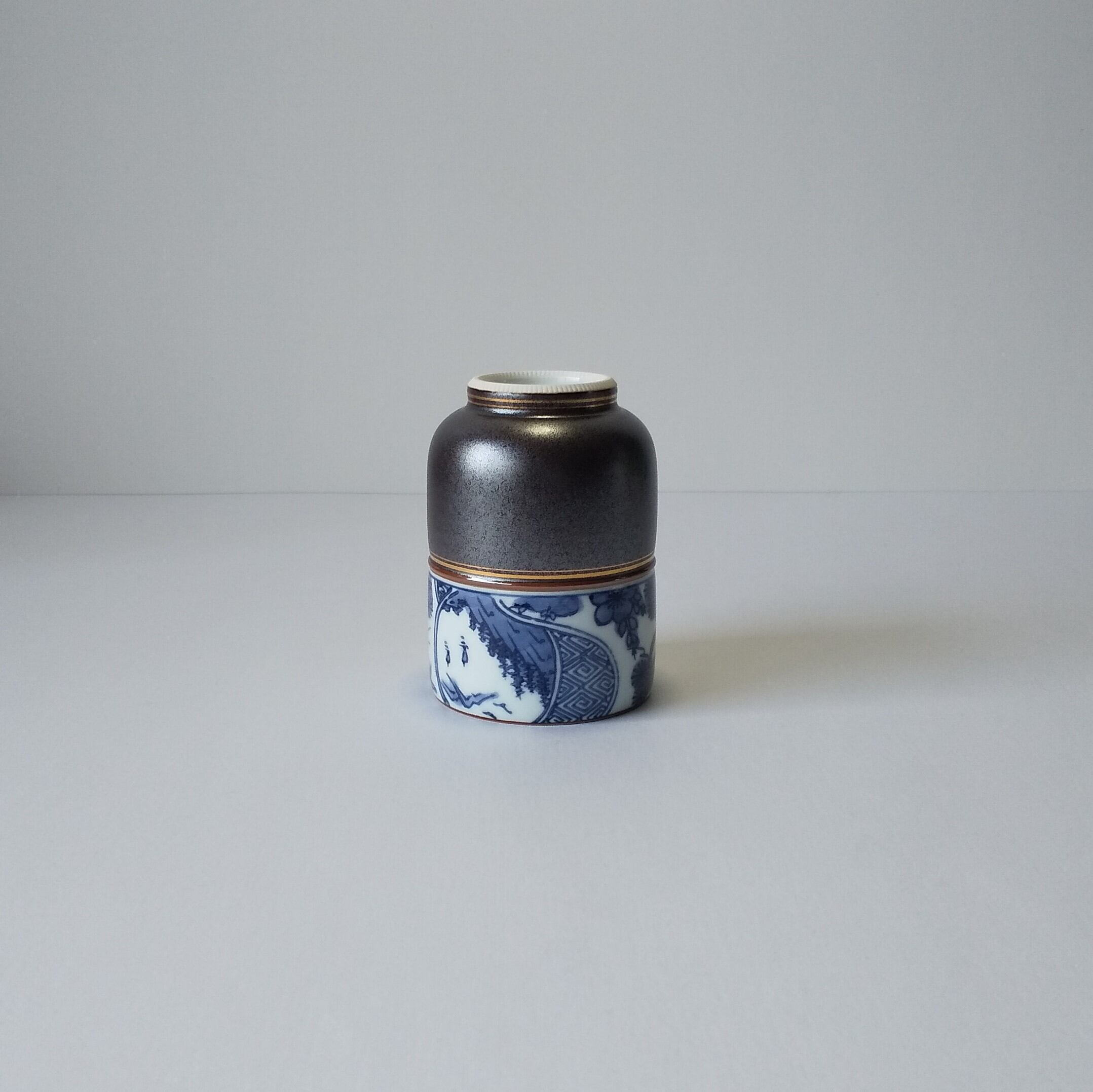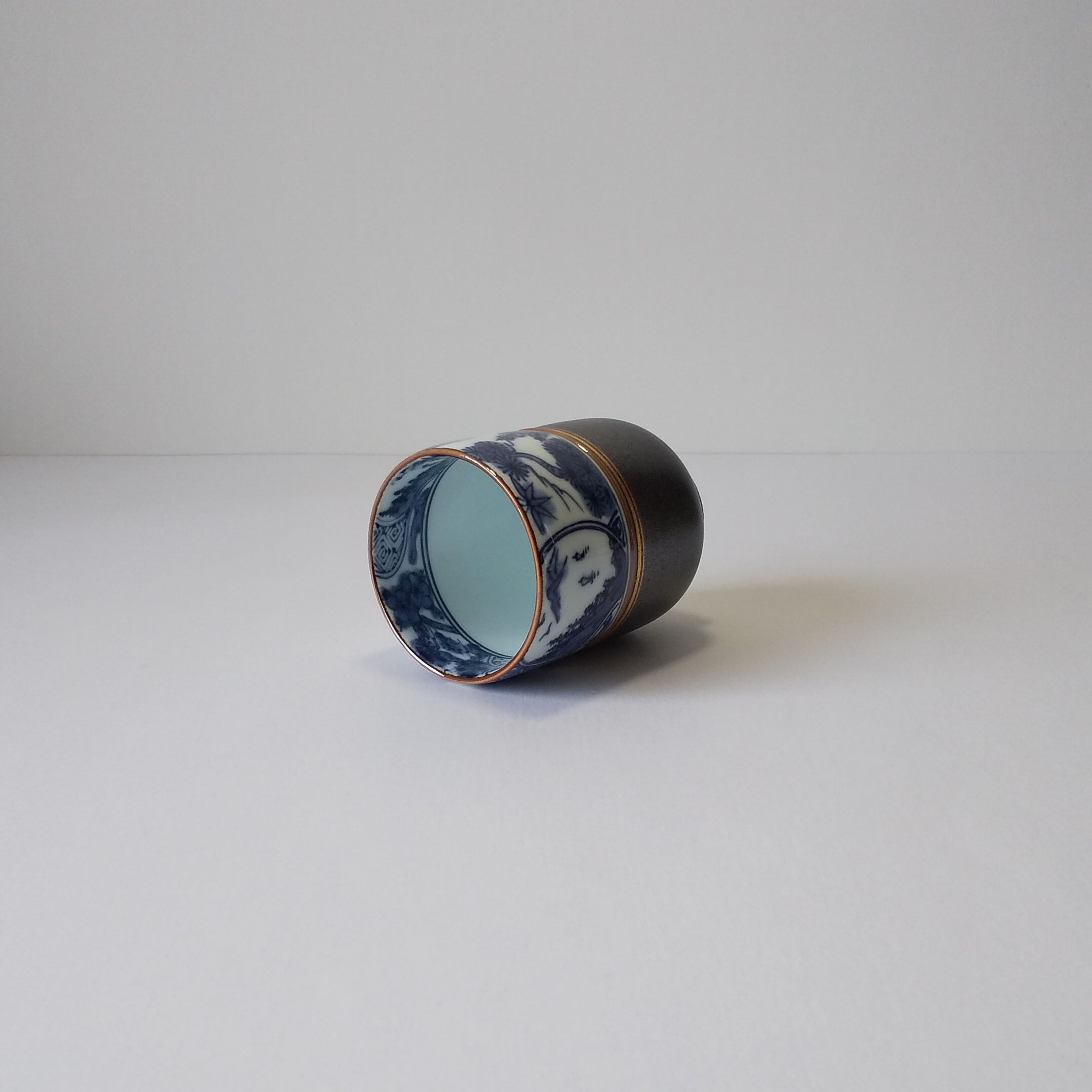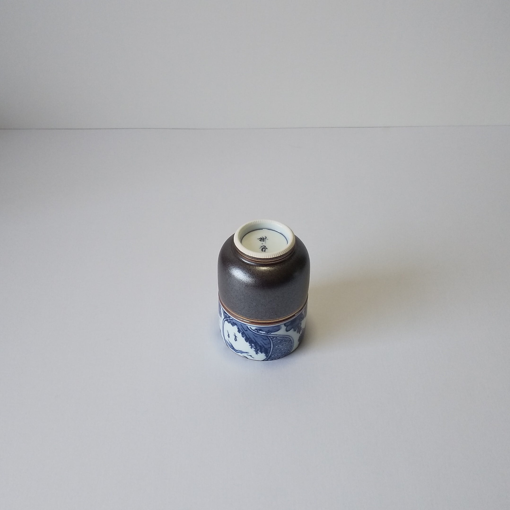 6.7xH9.6㎝ 容量八分目入れた状態で180ml 染付山水松梅絵、外側腰から下錆塗り、内側渕から2㎝位まで山水絵柄入り 落ちついた雰囲気の湯吞です 金筋を入れてありますから レンジx