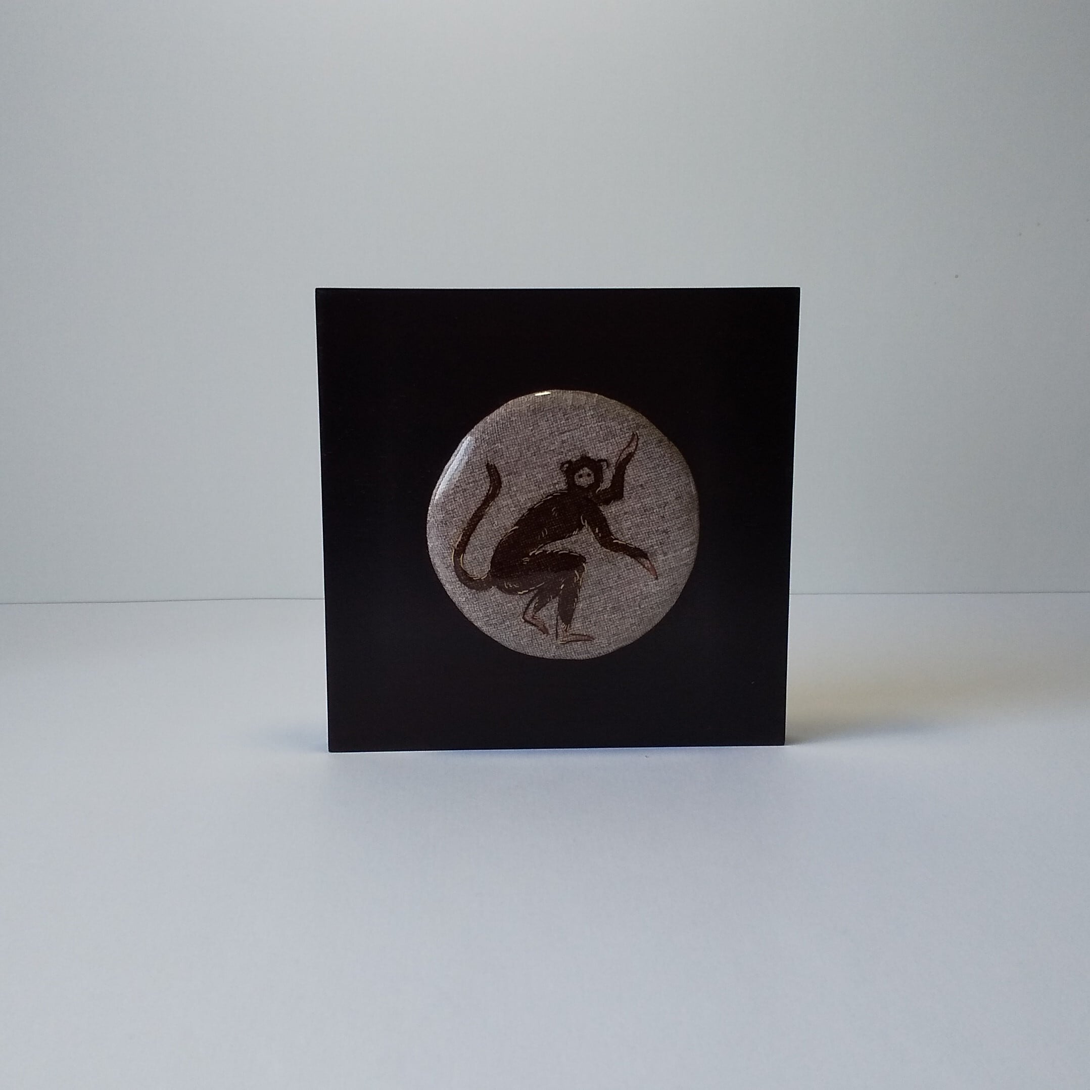 茶木台18㎝、猿丸陶板10.3㎝、おどけた感じの茶色に金線で毛並みを縁どりてあります、 布目地肌の手書き手造り感が出た壁掛けです 裏に壁掛穴、紐ついております