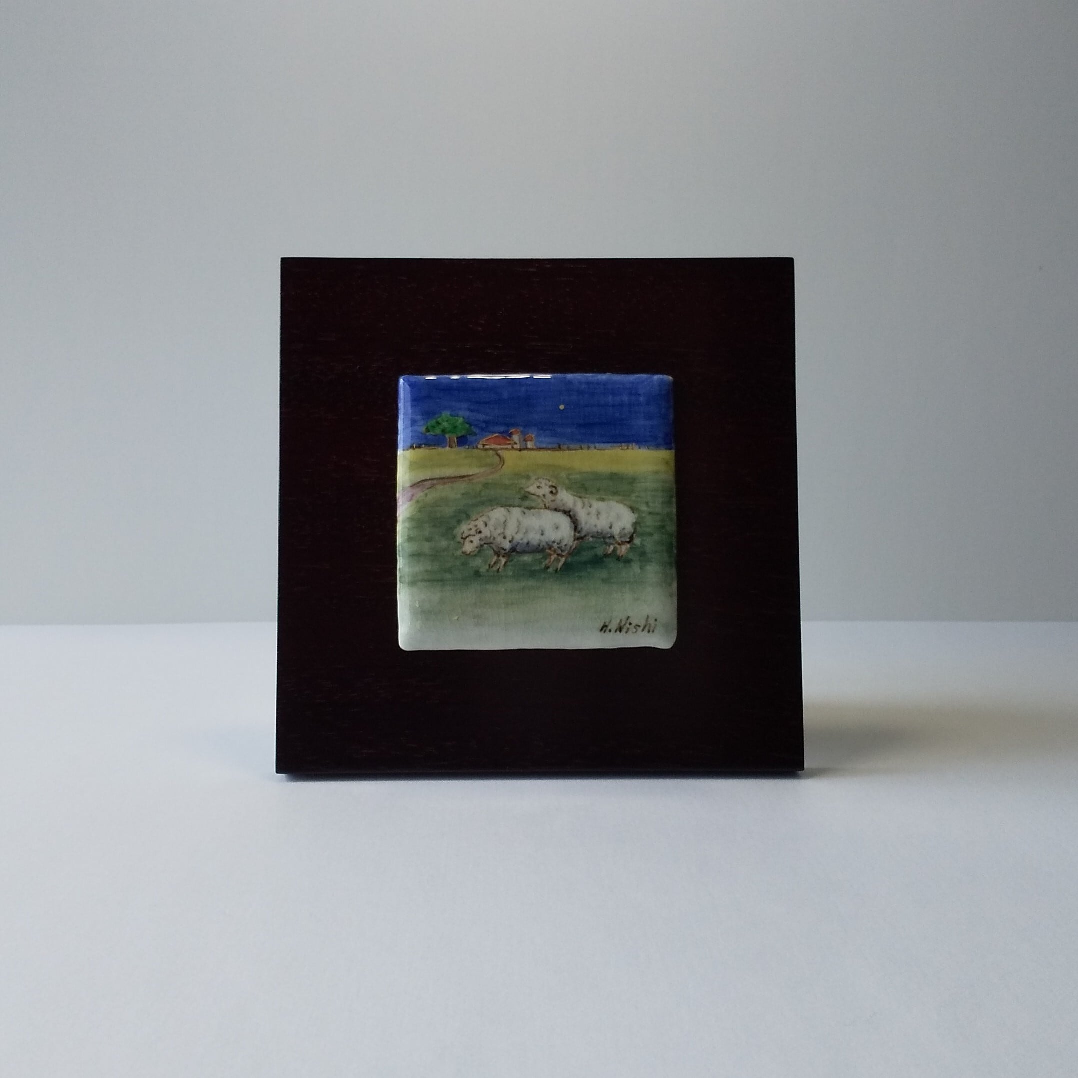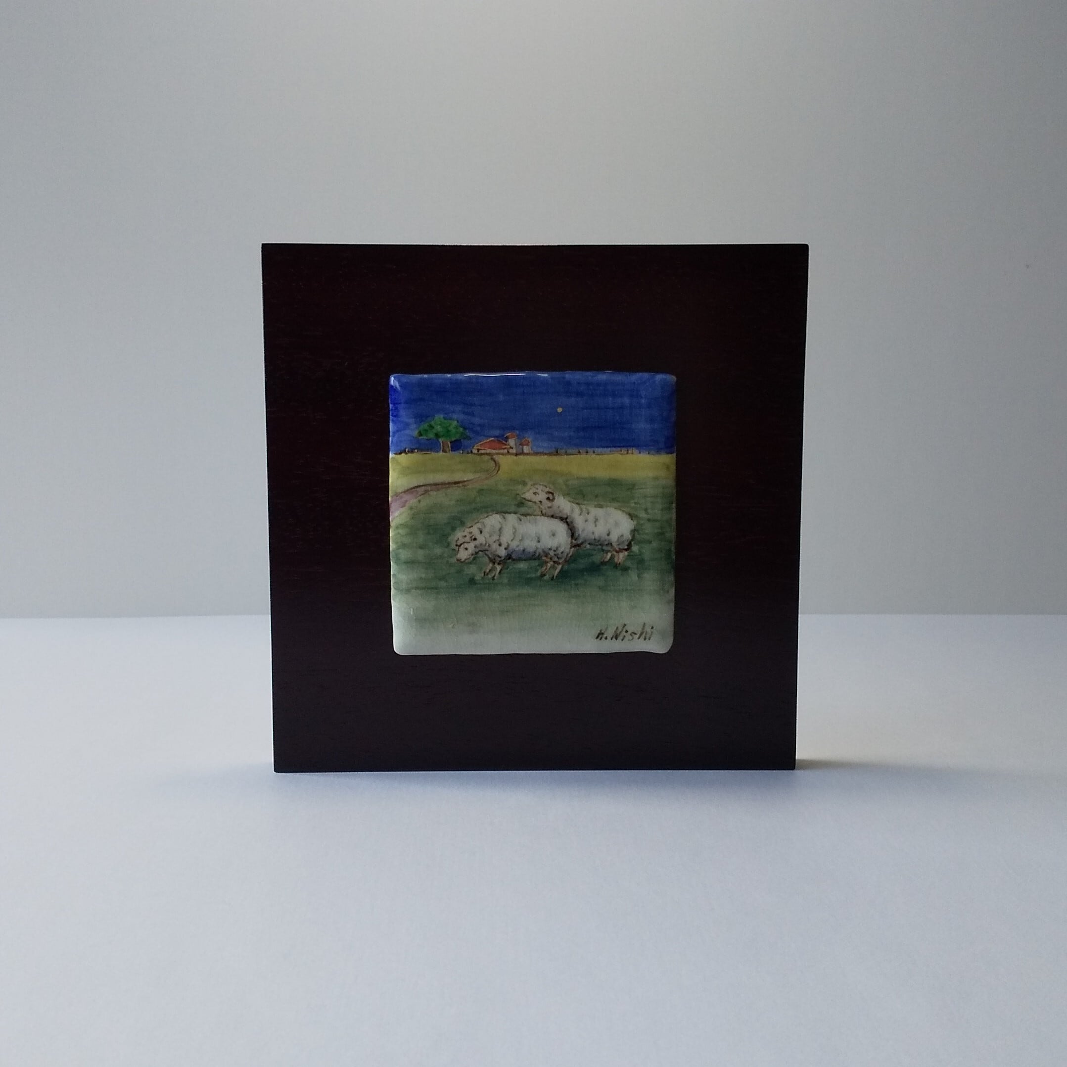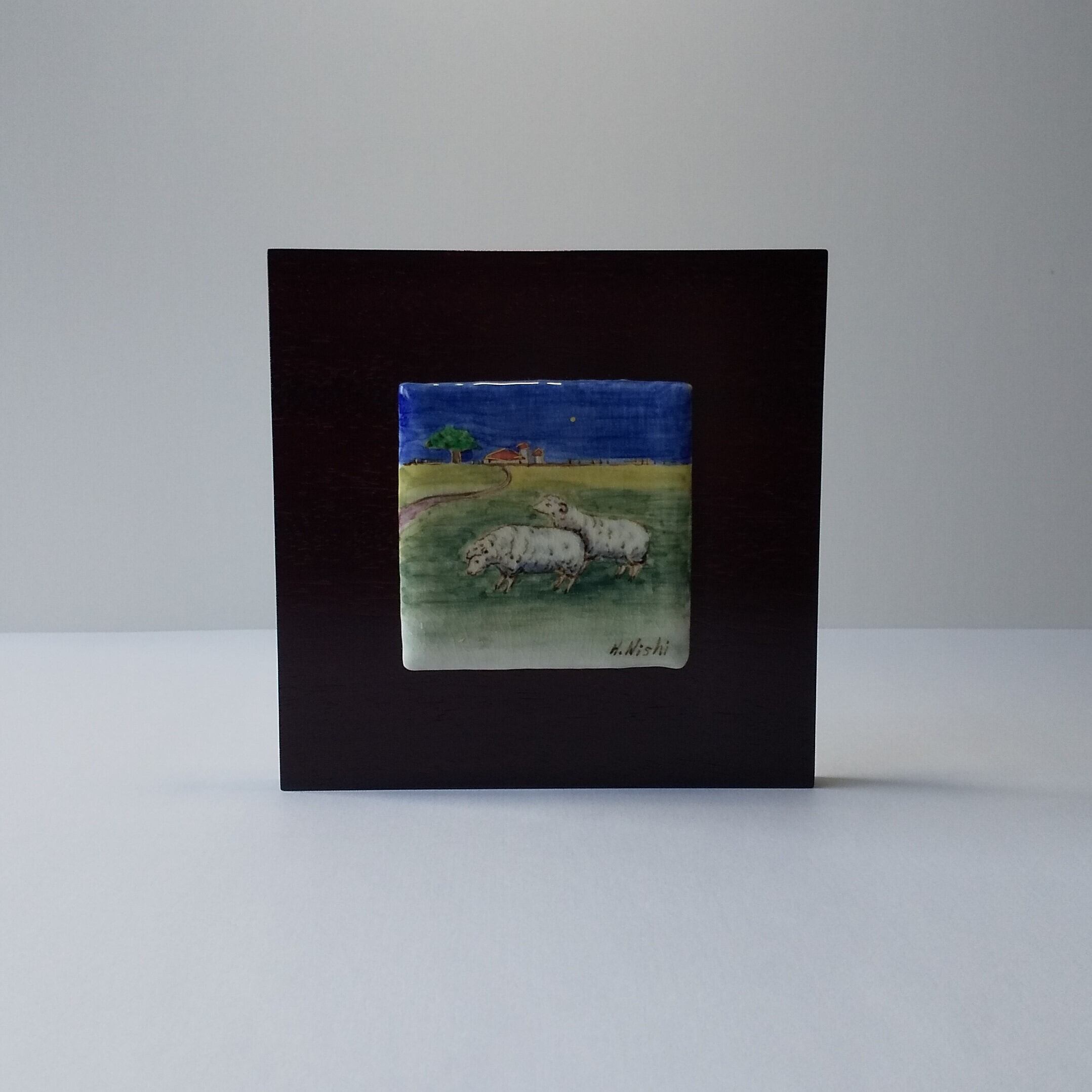 茶色額板18㎝、羊正角陶板9.5㎝、田園風景(牧場)に二頭の羊がたわむれています やわらかい(やさしい)感じの壁掛けとして手造り淡い牧草地の緑、飽きが来ないような額縁です 裏側に壁掛用穴、紐付き