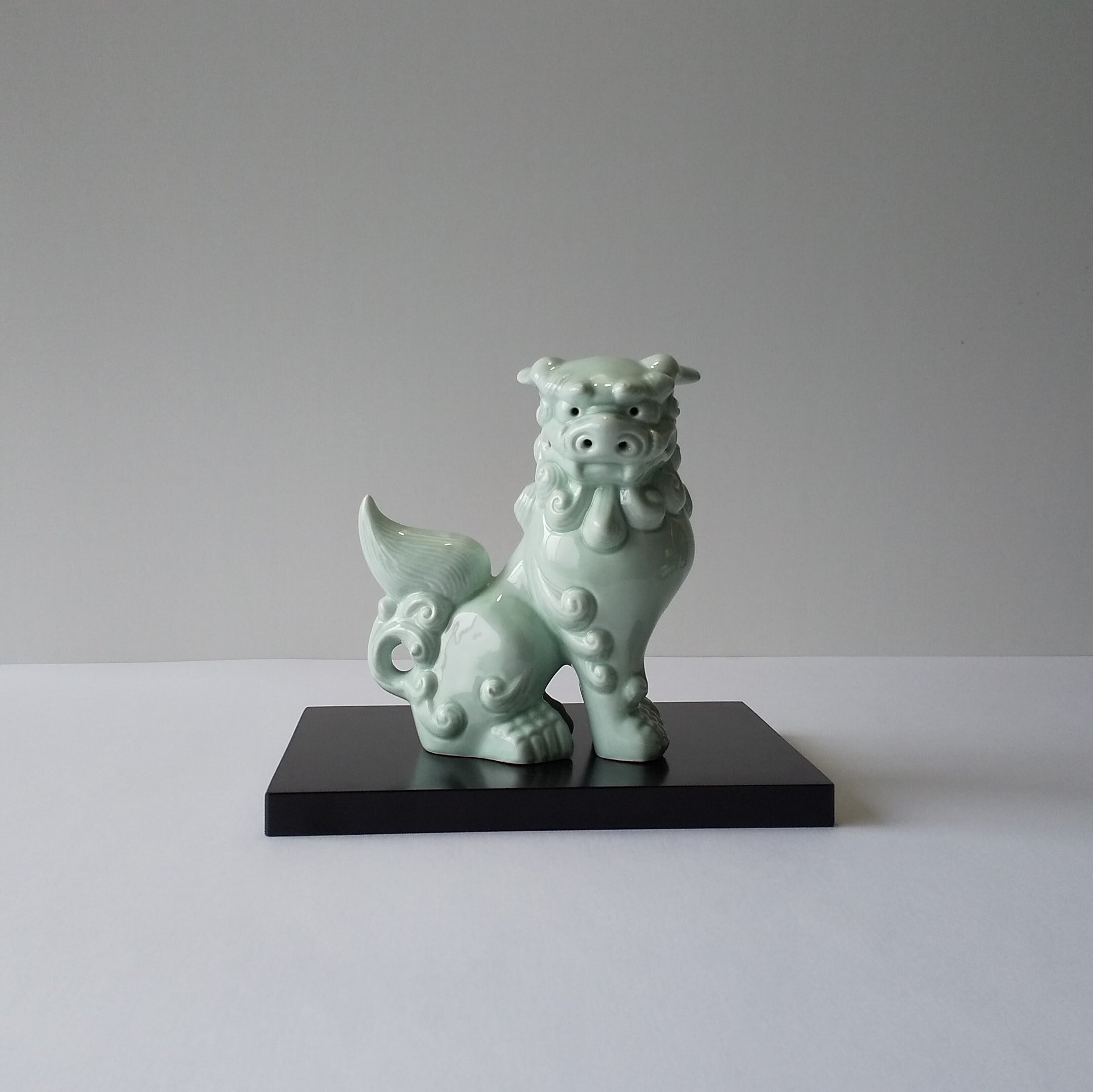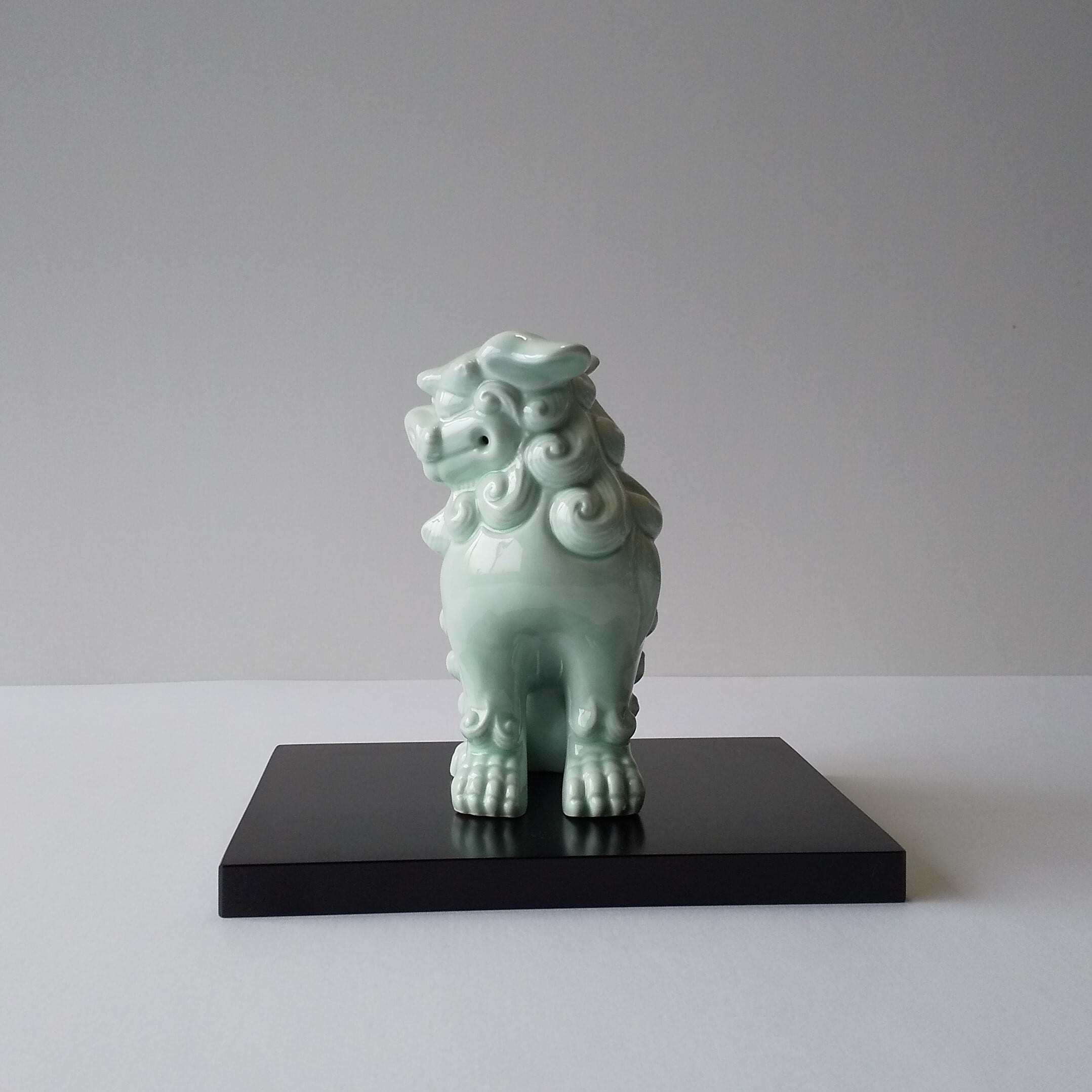 青磁狛犬13ⅹH15㎝ 有田焼の狛犬です、お守りとして置物、調度品して 綺麗な緑青磁いろです安定した形状です 木台は撮影用でして別単価となつております、