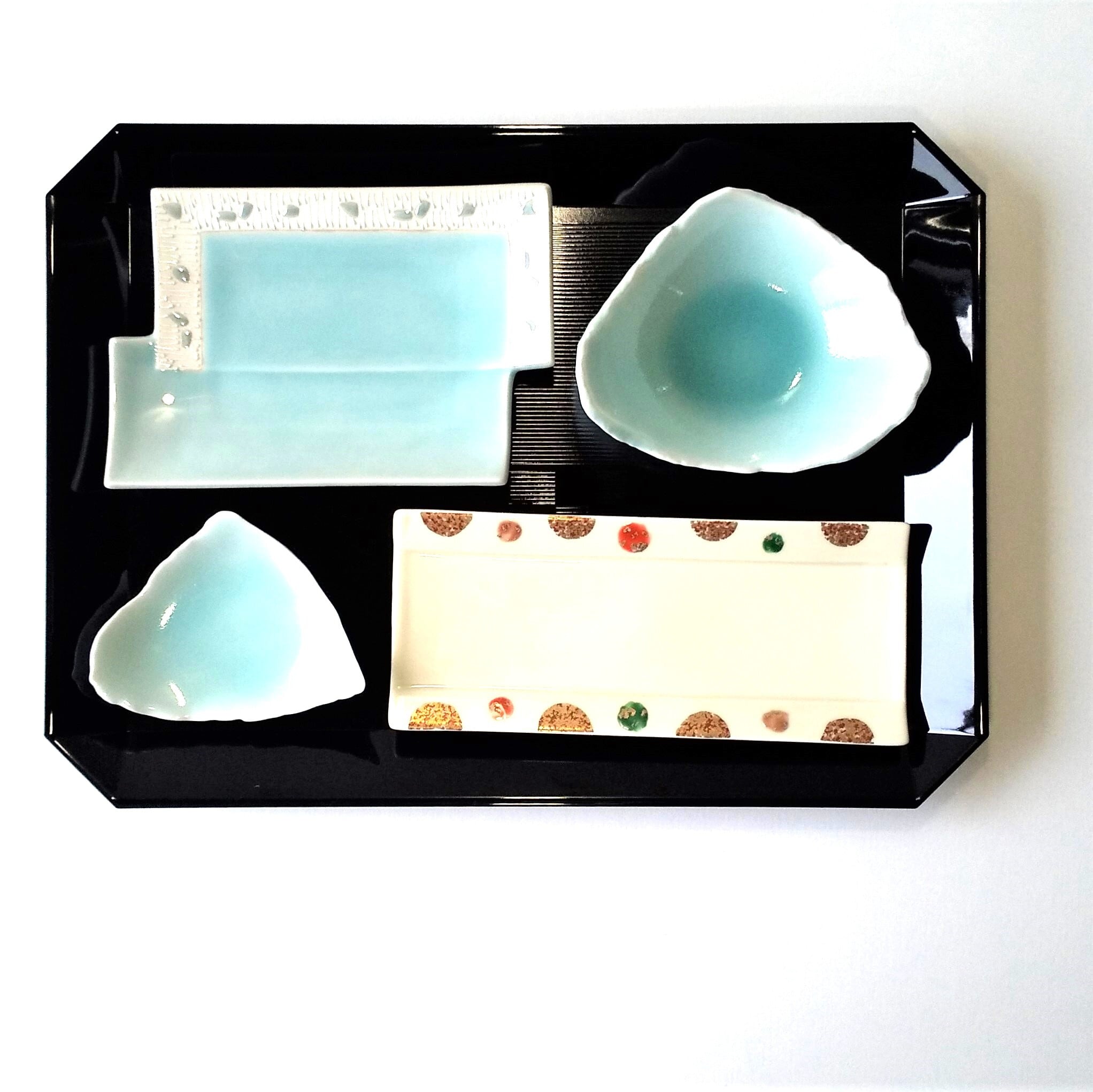 青磁二枚重ね焼皿(深みのある青磁)焼き物以外に二重の形状で幅広い料理にお使いいただけます w17.5xd13㎝ 前菜皿、象牙釉金吹付渕に朱、緑手描き紋、おつまみ、前菜等にお使いいただけます w13xd9.7㎝上品なアイボリ色 ちぎり(手でちぎった)青磁小皿、青磁の色あいとちぎった形が良いです 〃 小鉢少し深めの形と深みのある溜まりのある青磁と渕の変形がいいです、サラダ、デザート、小鉢として使用出来ます