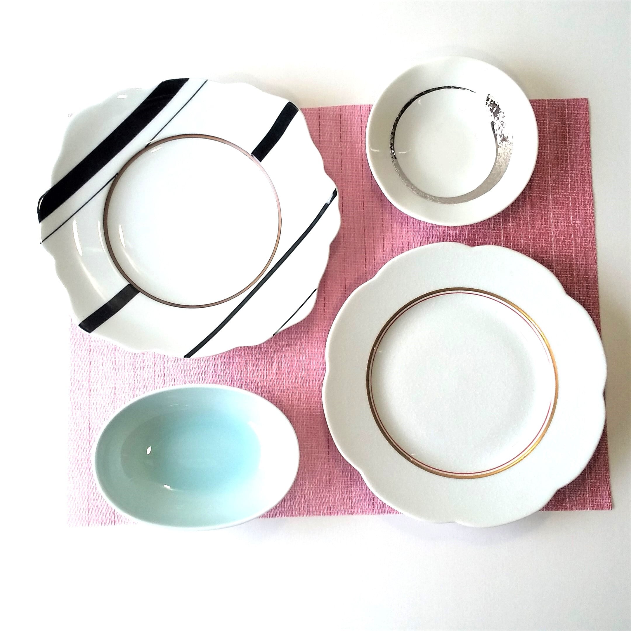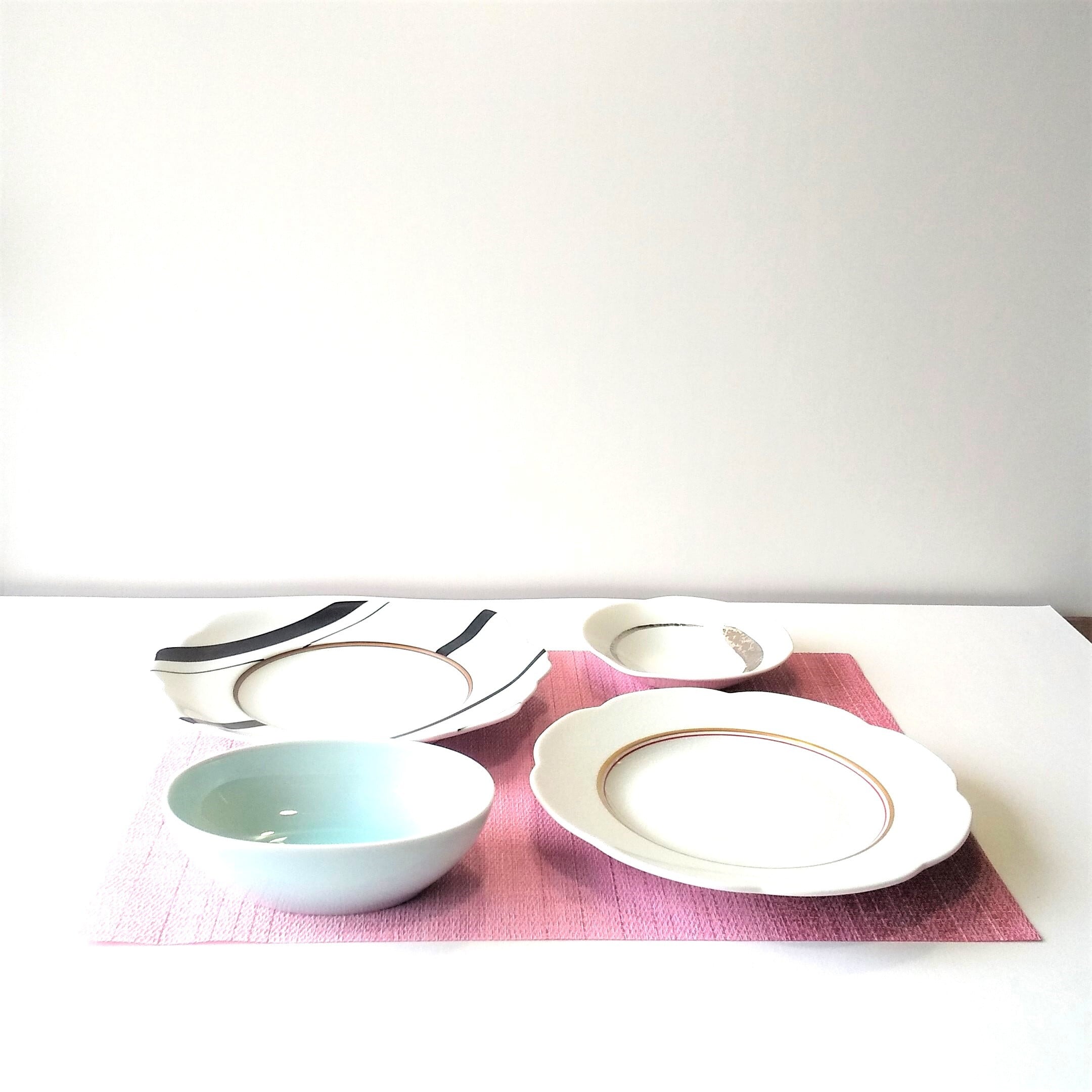 花型内金筋皿 w23.5㎝ 黒筋入り皿 w 24.5xd23.5㎝ 両方とも洋、和風として使用出来ます 青白磁上品な楕円鉢、サラダ等に使用したらピッタリです w16xd11.3xh5㎝ プラチナ線小鉢少し深めのサラダ鉢等使用できます
