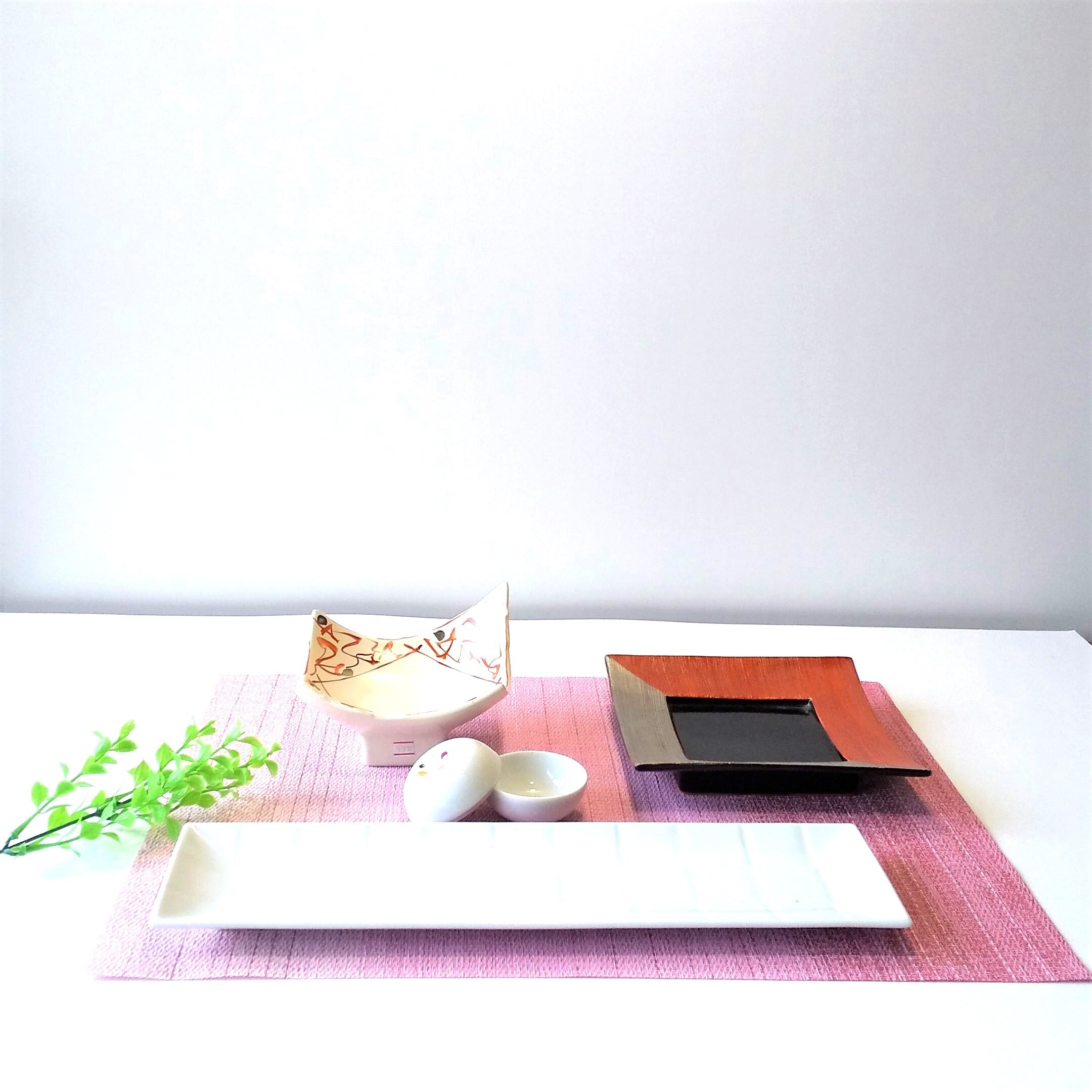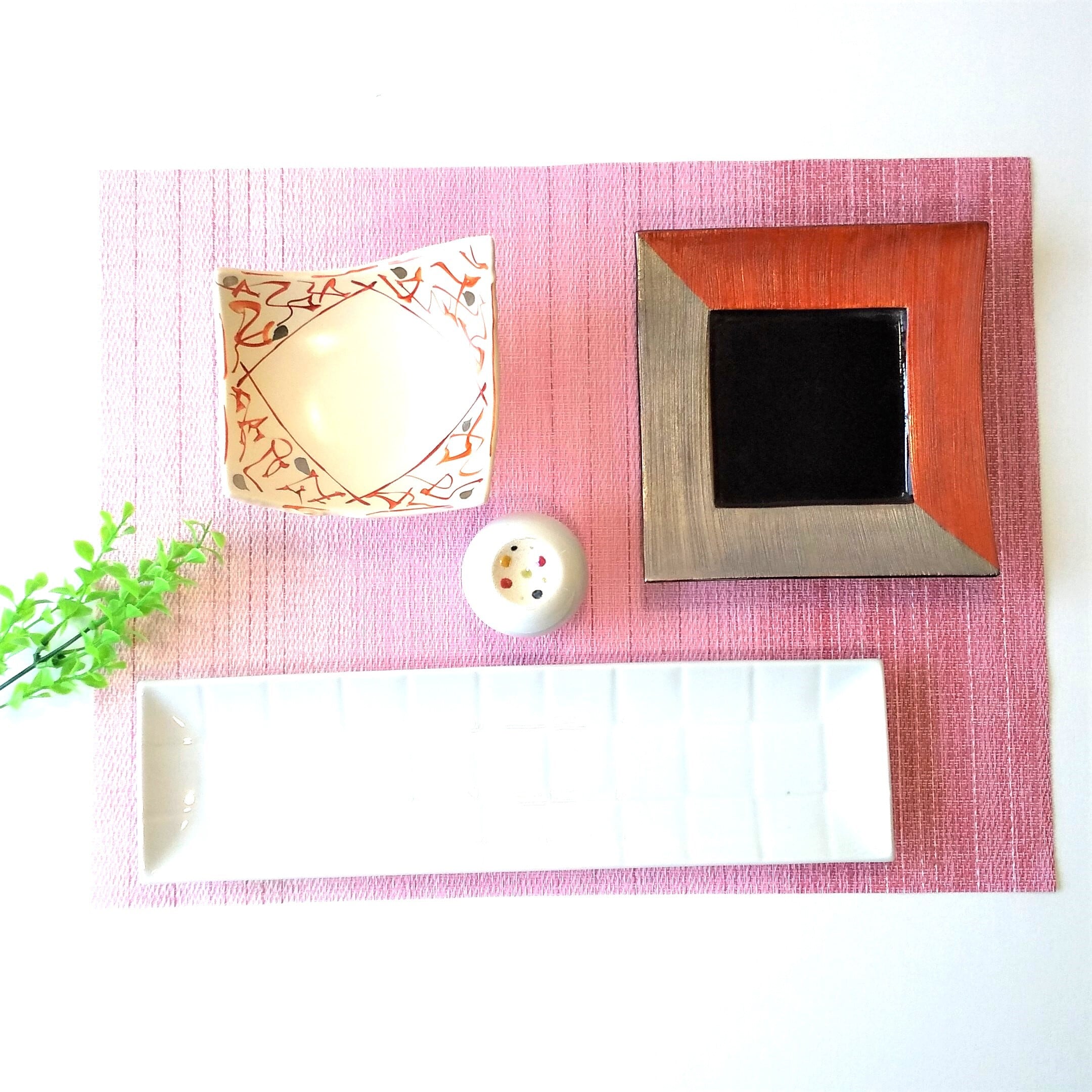 赤,銀正角皿 w16㎝ 両上り渕銀、朱角皿中央に少し料理を盛つて下さい、 長皿 w34.5xd9.4xh1.8㎝ 前菜等にお使いいただけます 赤絵変形高台小鉢 可愛い高級感のある珍味入れ薬味入として使用出来ます