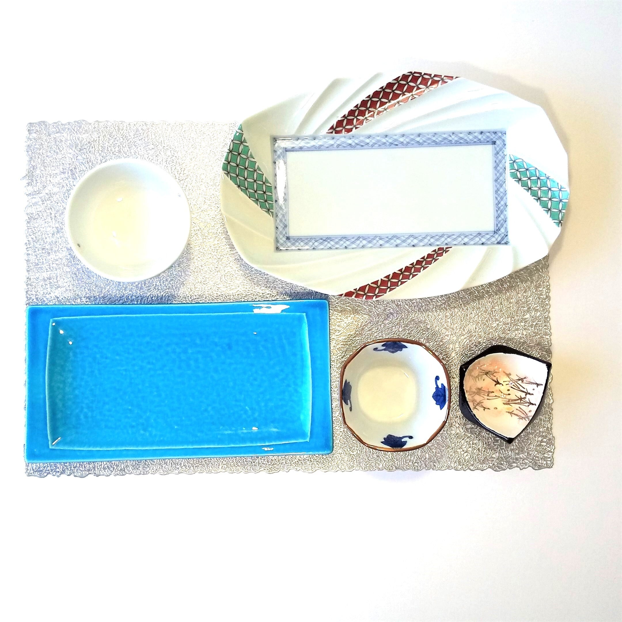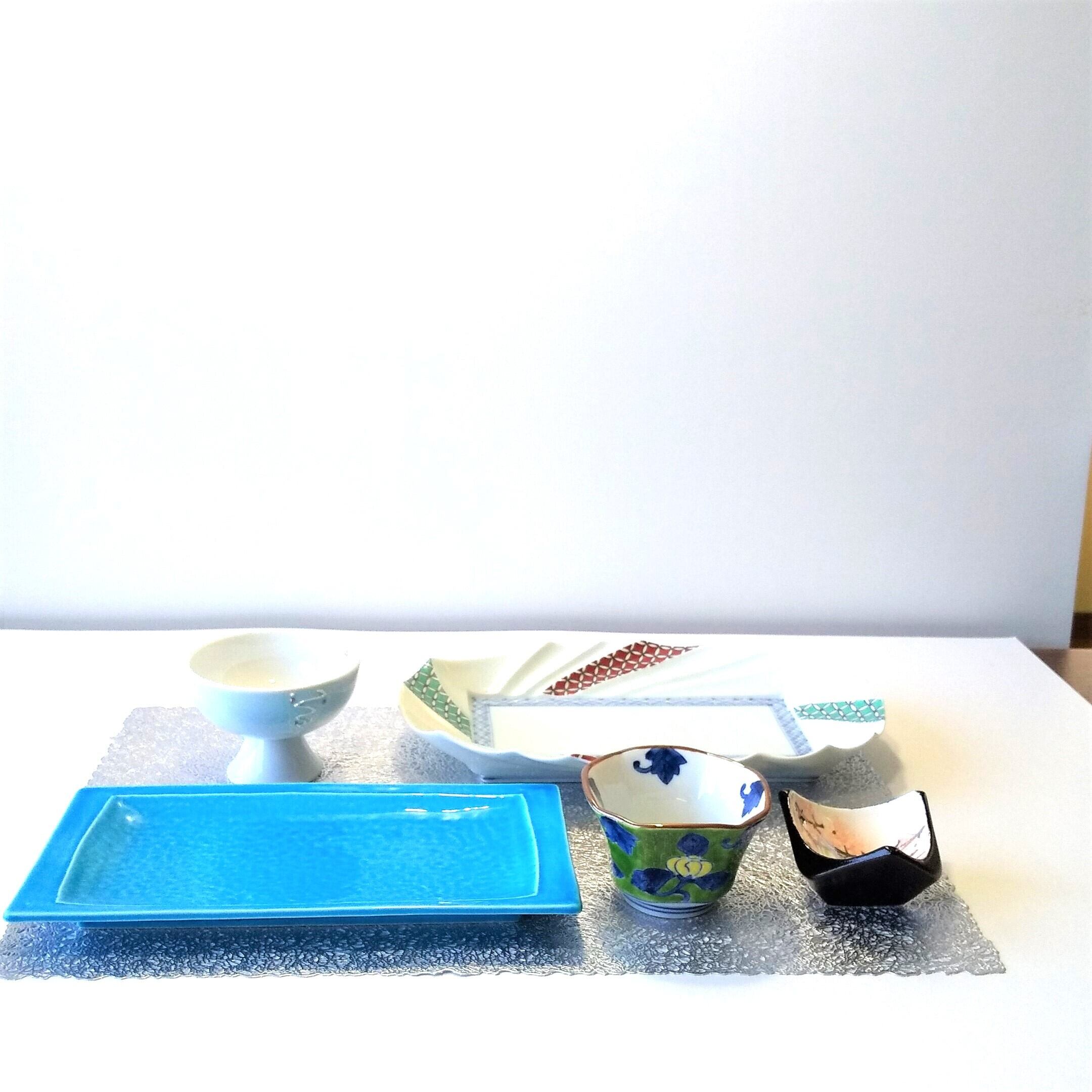 長盛皿、青交趾長皿、そして小鉢3つがセットになった贅沢な5点セットです。どの器も、有田の伝統的な技術と美意識が詰まった、美しいデザインです。