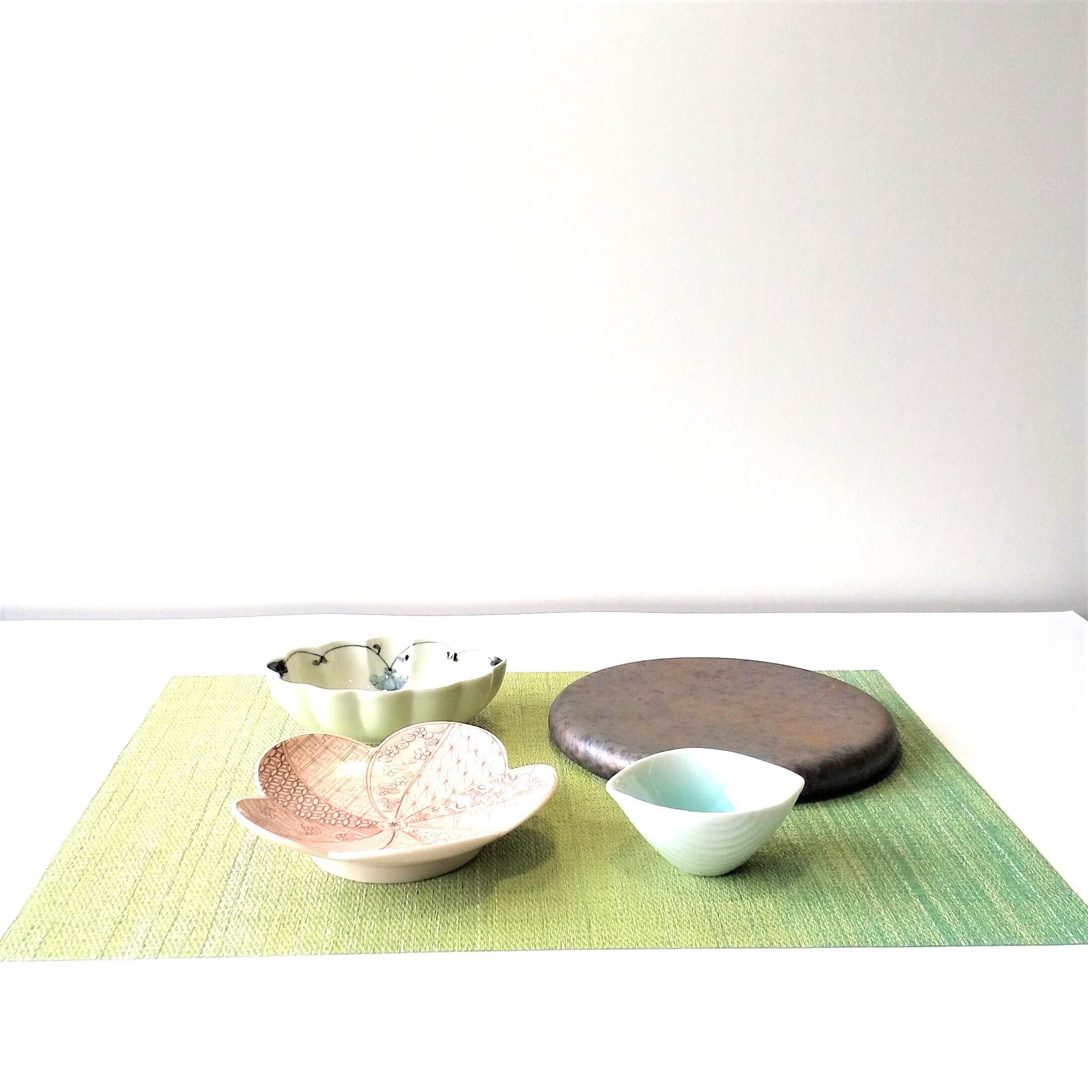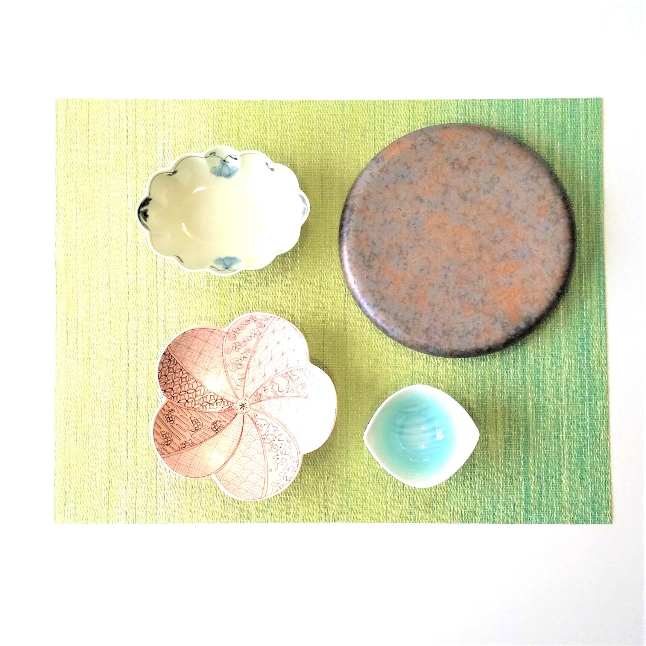 プレートはシンプルながら、今風のデザインでステーキ、焼き物様々なシーンに合わせて活躍します。濁しの入った木甲割染付楕円鉢は小鉢として梅形地紋皿は、フルーツやサラダにピッタリの取皿として重宝します。そして、青辰砂小付は青緑色の小さい上品な器に、珍味入れとしても活躍。