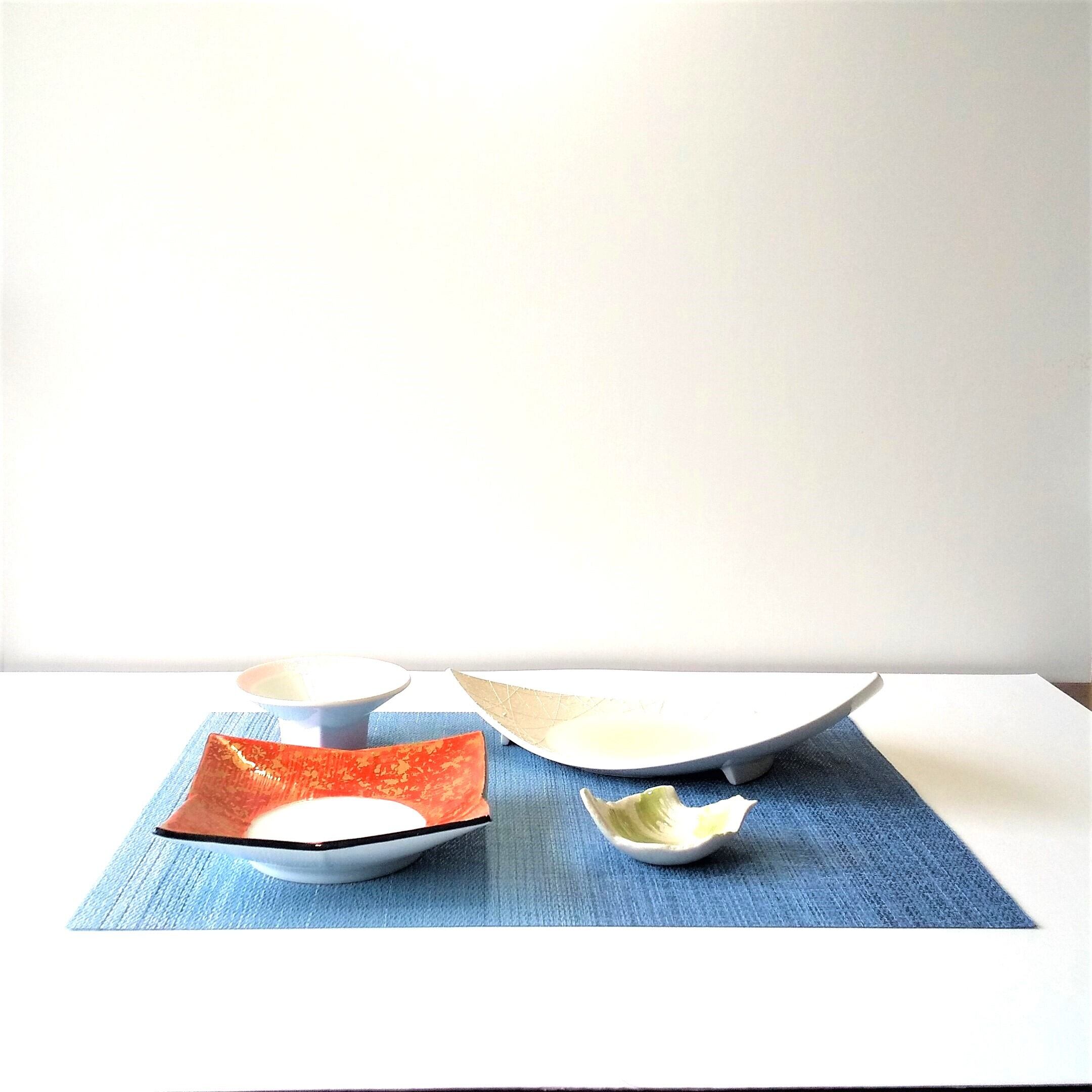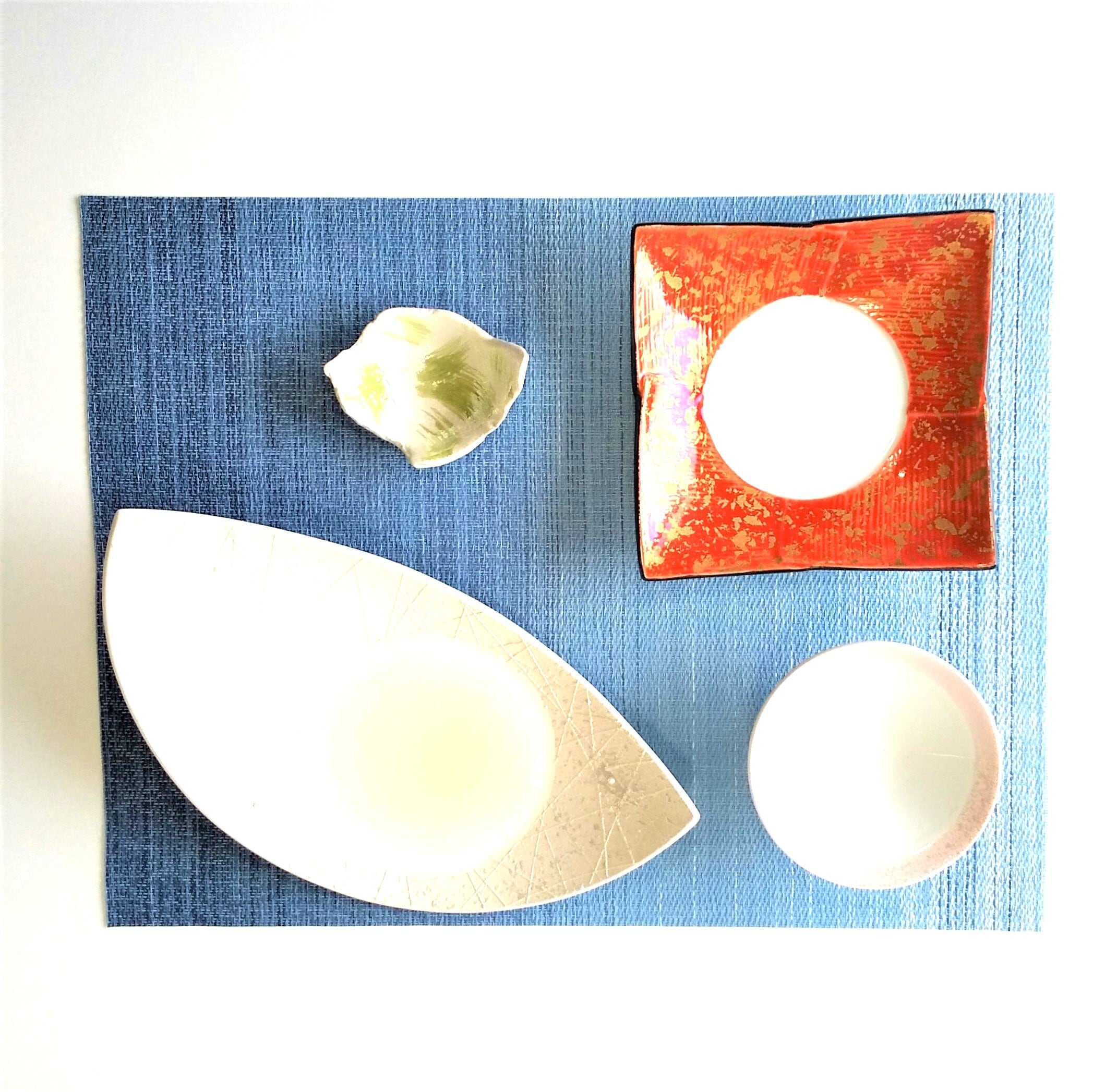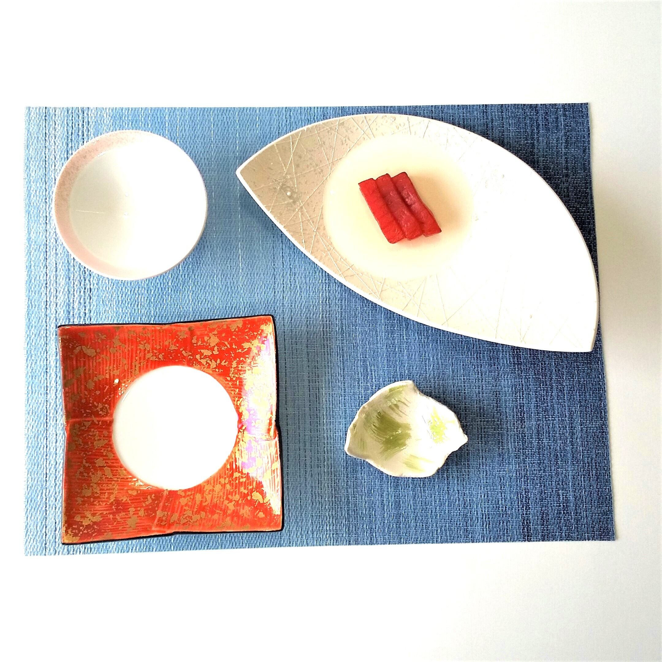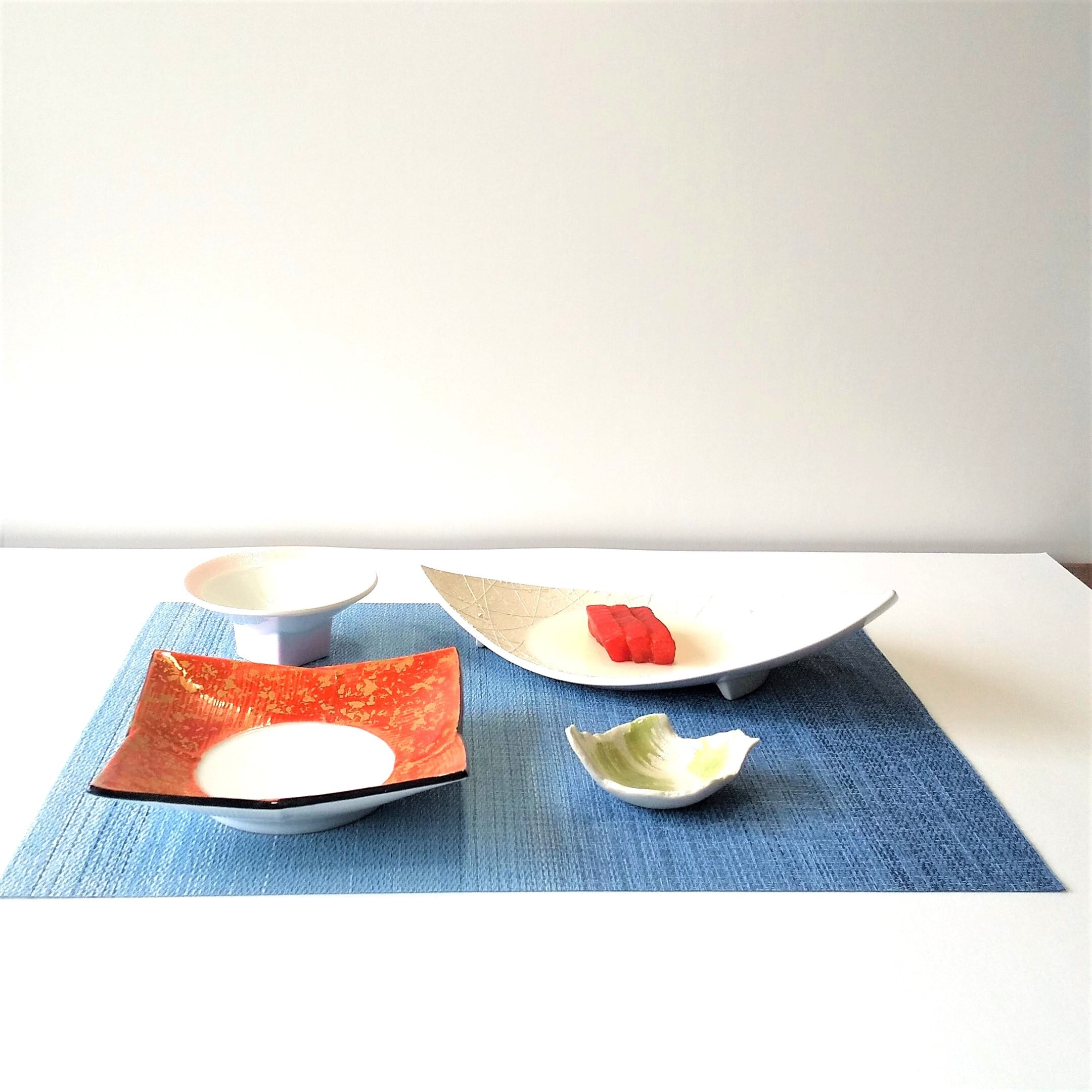 三日月刺身鉢、和風な雰囲気が漂う赤金散し正角鉢、可愛らしいピンクラスター高台鉢、ちぎり珍味。それら4点セットが詰め込まれたお得なセットです。 三日月刺身鉢は、三日月型の丸の中央に刺身、自然に盛り付けられます。赤金散し正角鉢は、エレガントな見た目で、和食や洋食に合わせられます。ピンクラスター高台鉢は、前菜として、ちぎり鉢珍味いれとして 美しく実用的な食器で季節感あふれる料理を、盛り付けてください、 三日月盛器w18.5xd15.5㎝・赤金散し正角鉢w16xh4㎝・高台鉢w11xh5㎝
