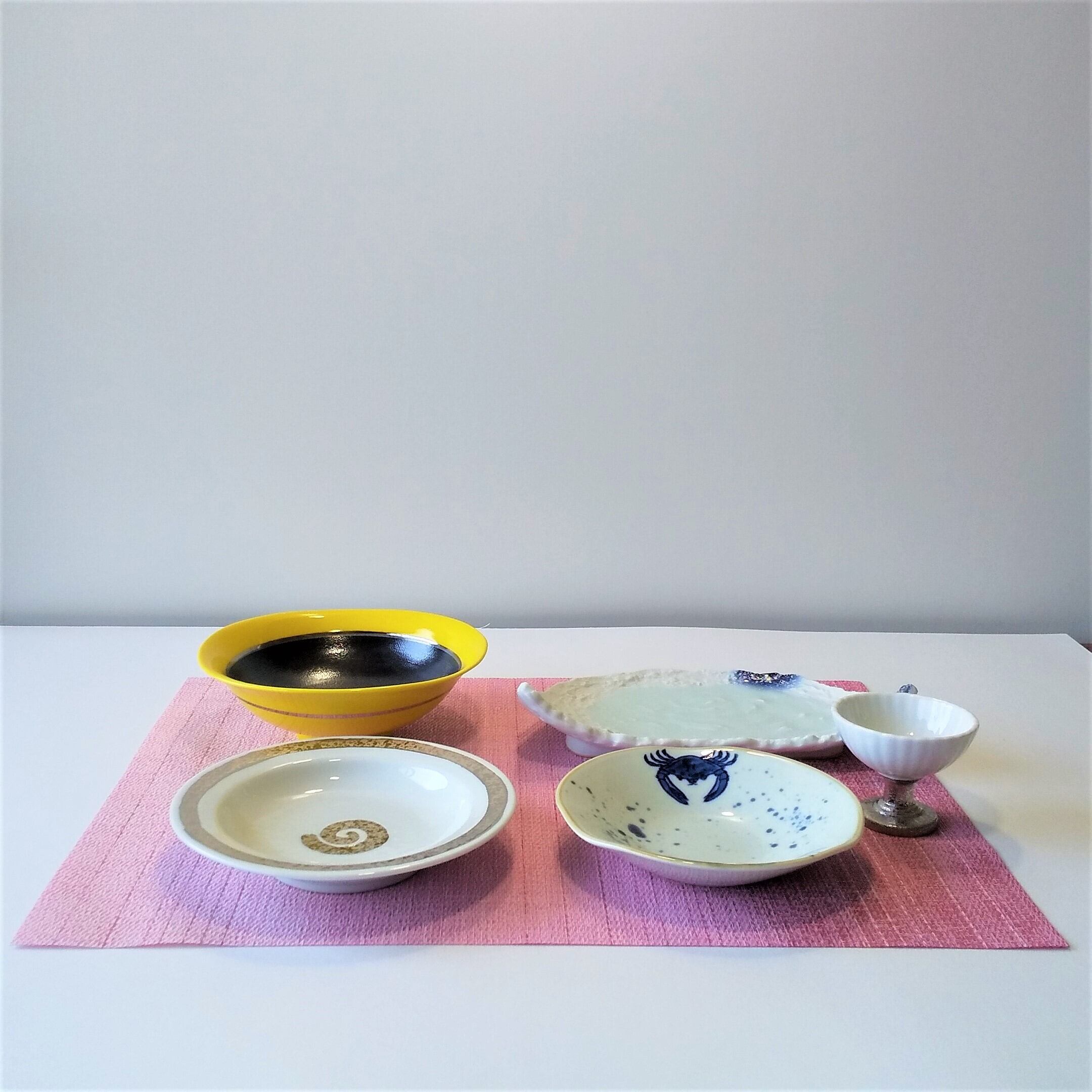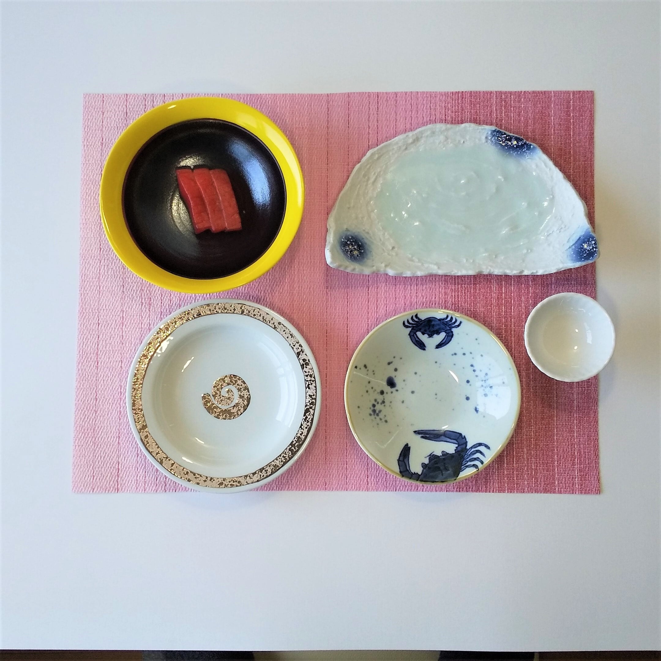 黄色向付と両上がり半月皿、プラチナ5.5皿、染付かに絵5寸皿、プラチナ珍味の5点セットをご紹介します。和食器好きの方にはたまらない、上品で優雅なセットです。