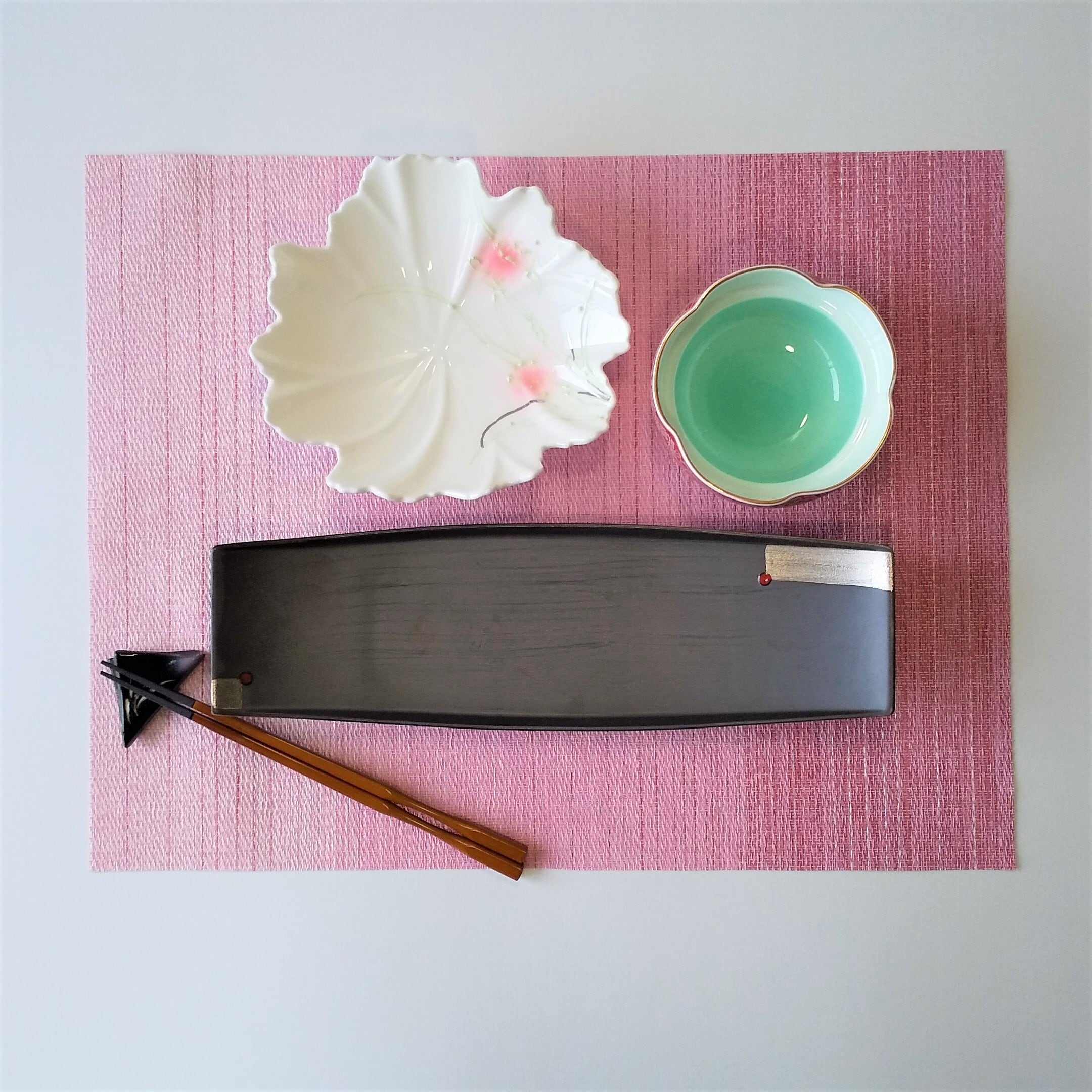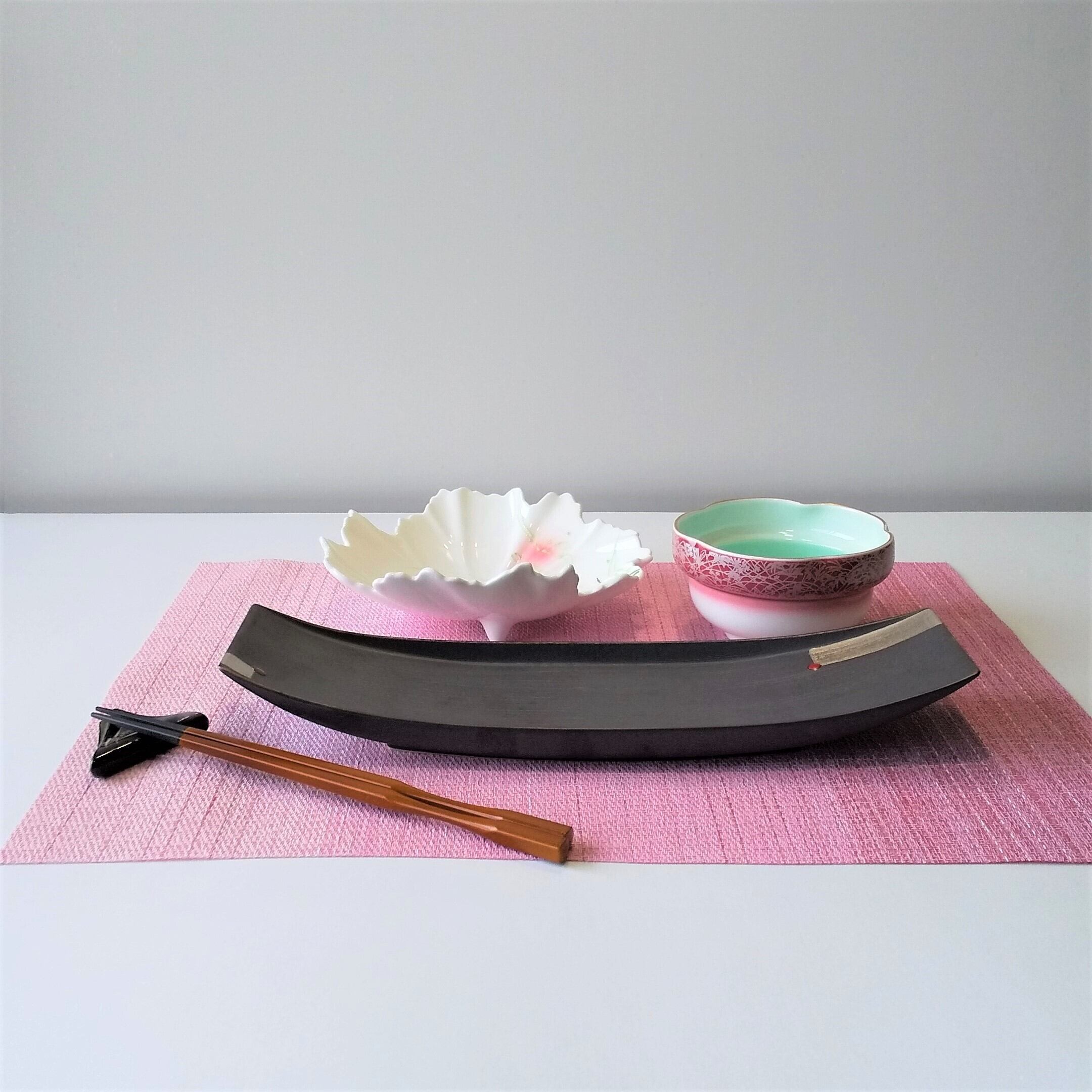 茶マツト長皿渕上りポイント的にプラチナ絵柄入り素敵な皿ですマツト(艶消し)w31.5xd10㎝ アイボリー花型鉢.渕は岩渕見込に可愛い草花を描いてありますサラダ等色々な料理に使用できますw18xd16xh5㎝ 外ピンク秋草絵内グリーン吹き小鉢w11xh6㎝ 金製品電子レンジは使用できません