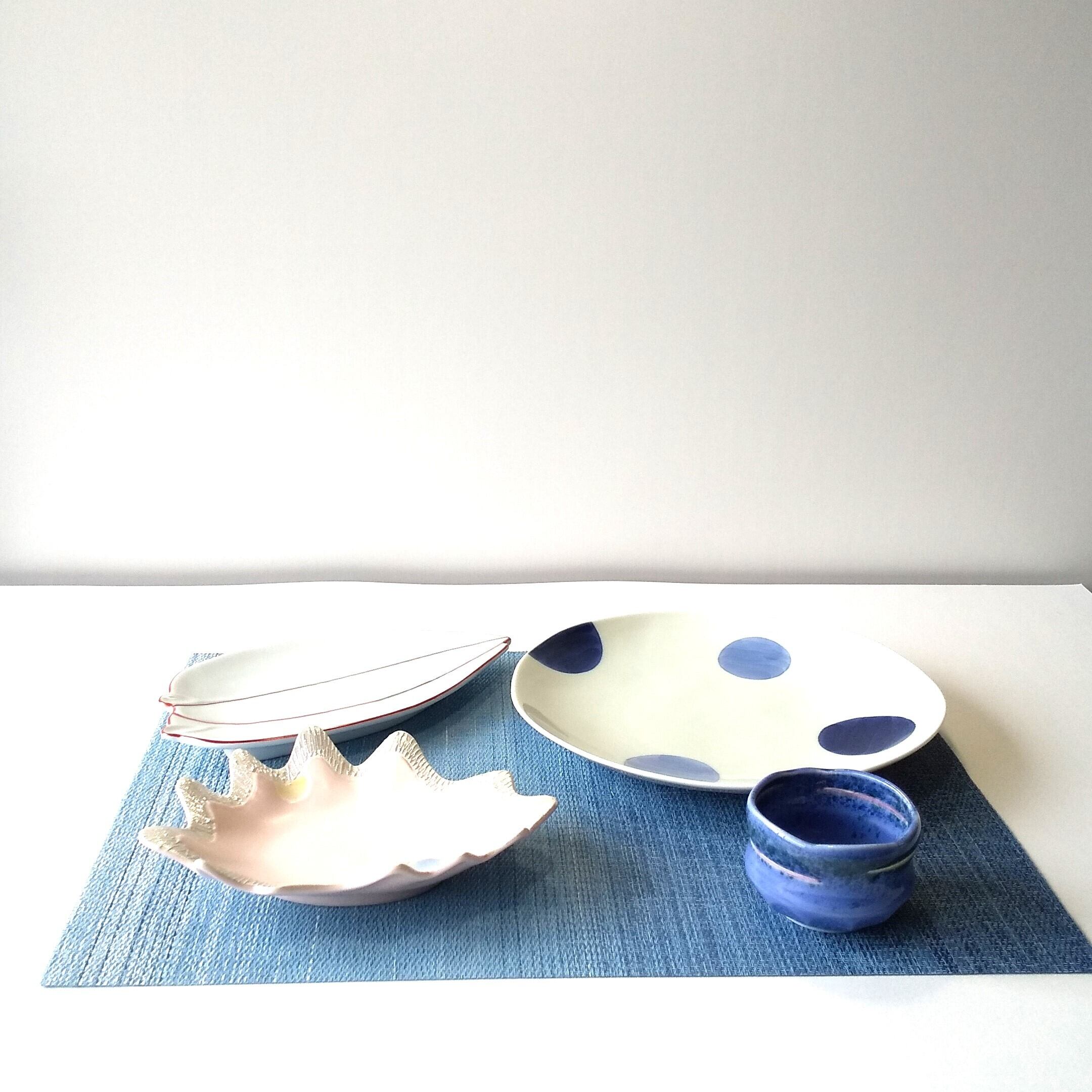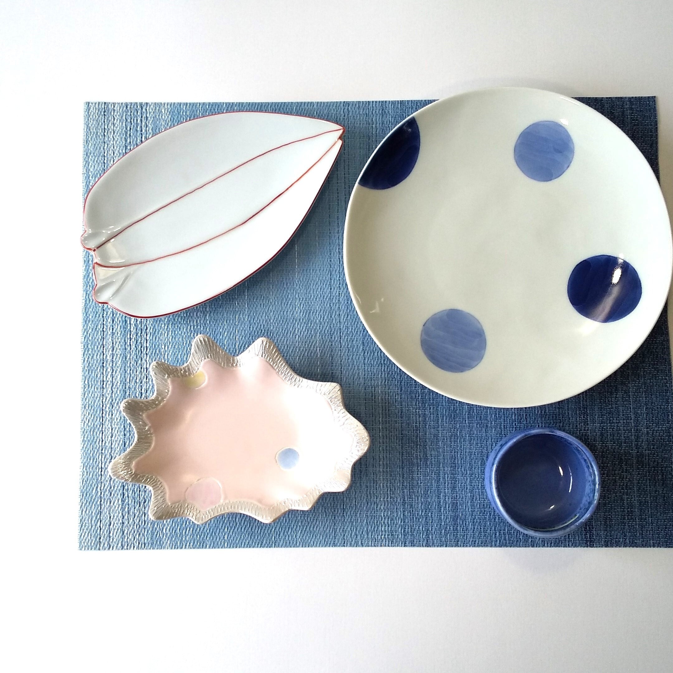 藍色丸紋8寸皿、和洋多様な料理に盛り付けたら映えます、藍色がシンプルです 赤線木の葉皿、焼皿前菜、主に和風的なイメージです アメーバピンクマツト釉皿、ピンク色の柔らかさと手描き渕プラチナ線入りの高級品な器です 蒼黒吹き小鉢、ちょつとした和え物等、小鉢として使用出来ます、かわいい器です