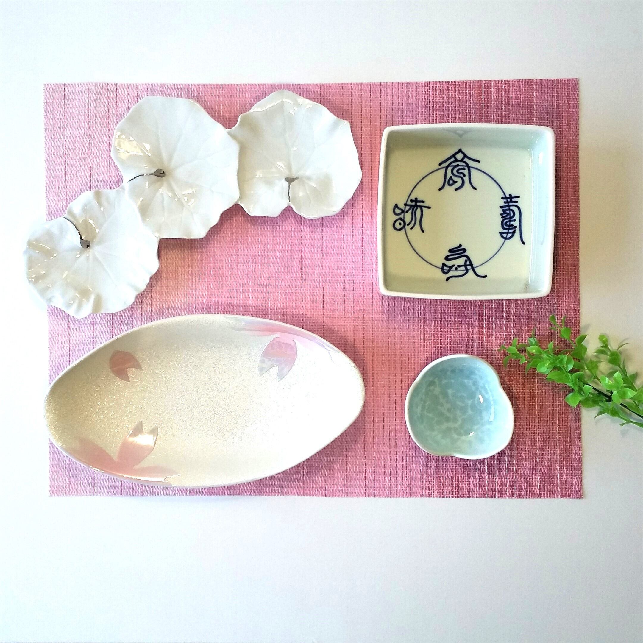白磁、プラチナ(茎の部分)三点盛、つわ、形状良くて、白(白磁)が上品です、ちょつと盛として 三点盛として 楕円桜ラスター少し深めの為汁のある料理も、煮魚、刺身、サラダ、ミニカレー多用鉢 染付文字入り正角鉢(手書き)煮もの、刺身、盛り合わせ、菓子鉢、漬け物、有田焼らしい重厚感があります