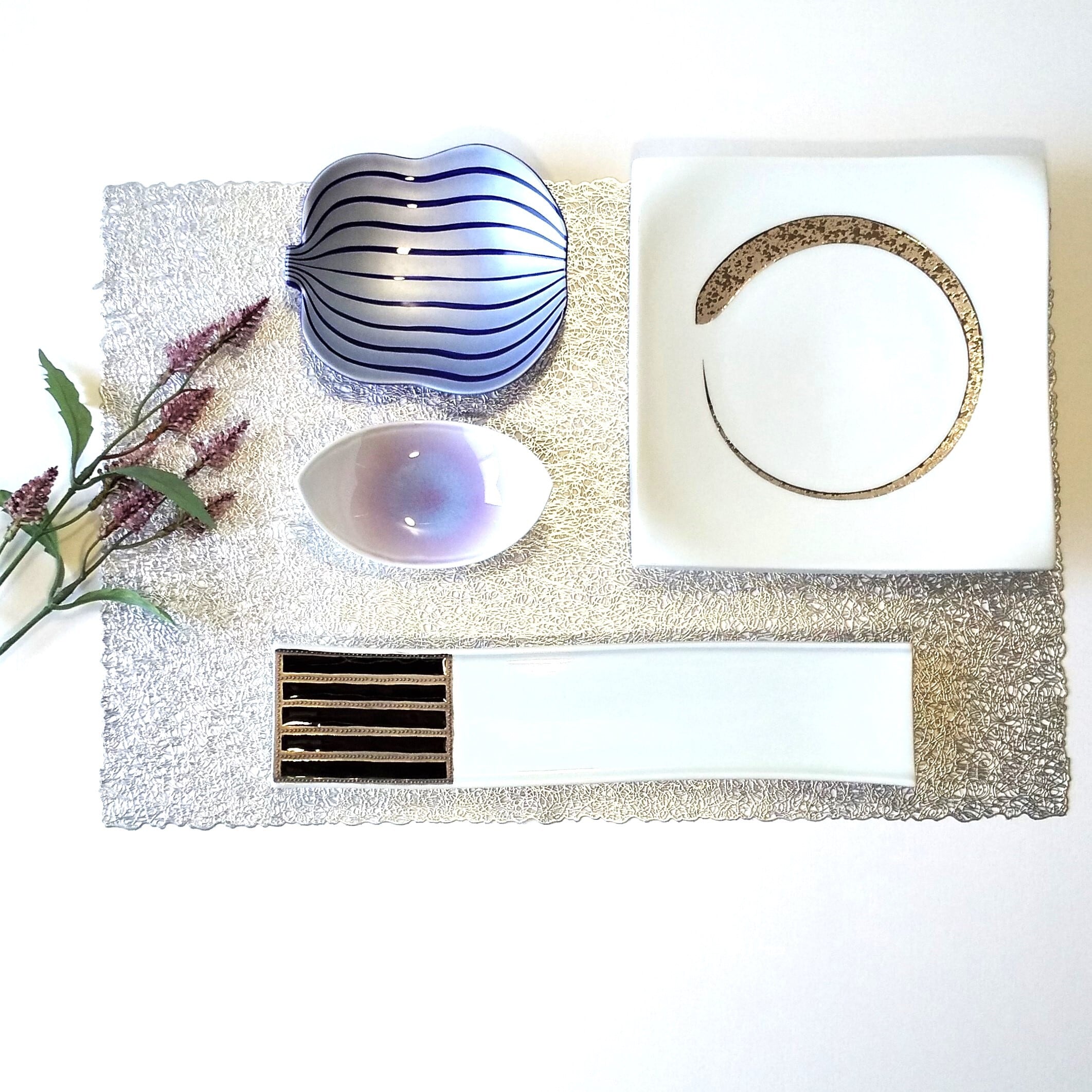 ルリ釉銀彩取皿、フルーツ、菓子,取皿等に使用できますちょうどいいサイズです 両上り珍味入れ、淡い紫吹き珍味小鉢として使用出来ます プラチナ長前菜皿、変形の形が斬新なデザインで、手描きと渕プラチナ黒が引き立ちます チョツト盛として使用出来ます プラチナ正角7寸皿、ちょうどいい大きさ、揚げ物、刺身、デザート等等幅広く使用出来ます プラチナが映えます