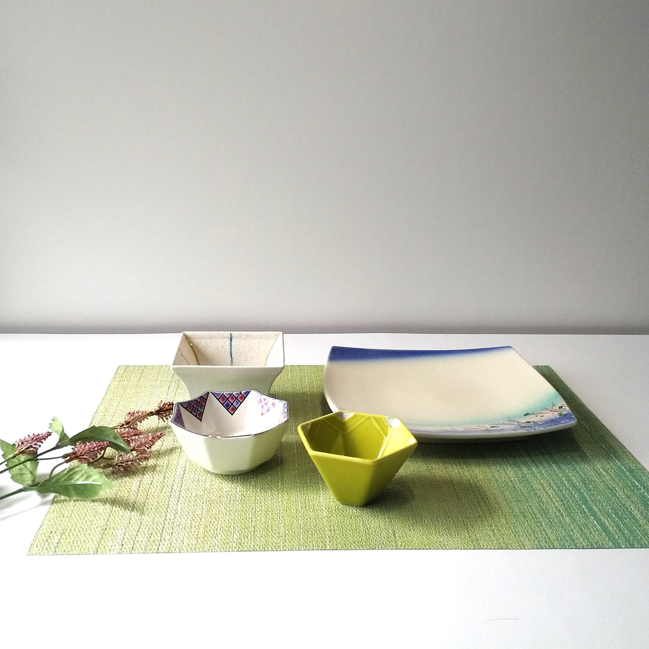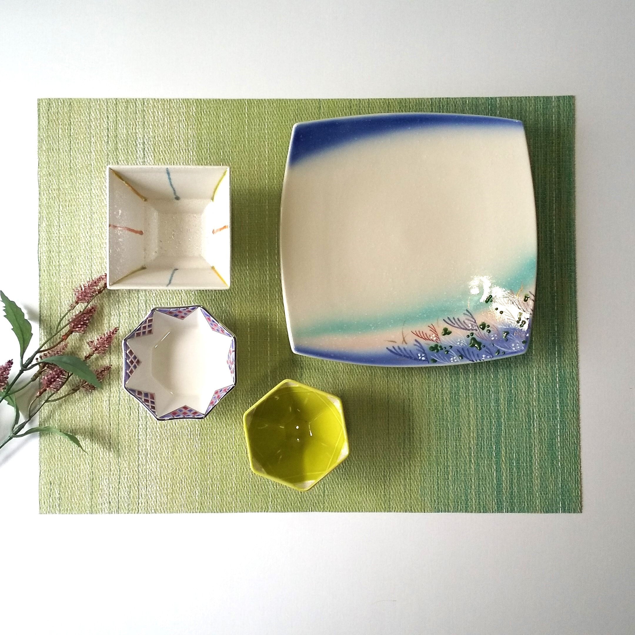 三色吹付あし絵8寸正角皿、手描きの高級品 十草小鉢 渕プラチナ八角小鉢 六角小付(ちょつとの和え物等)