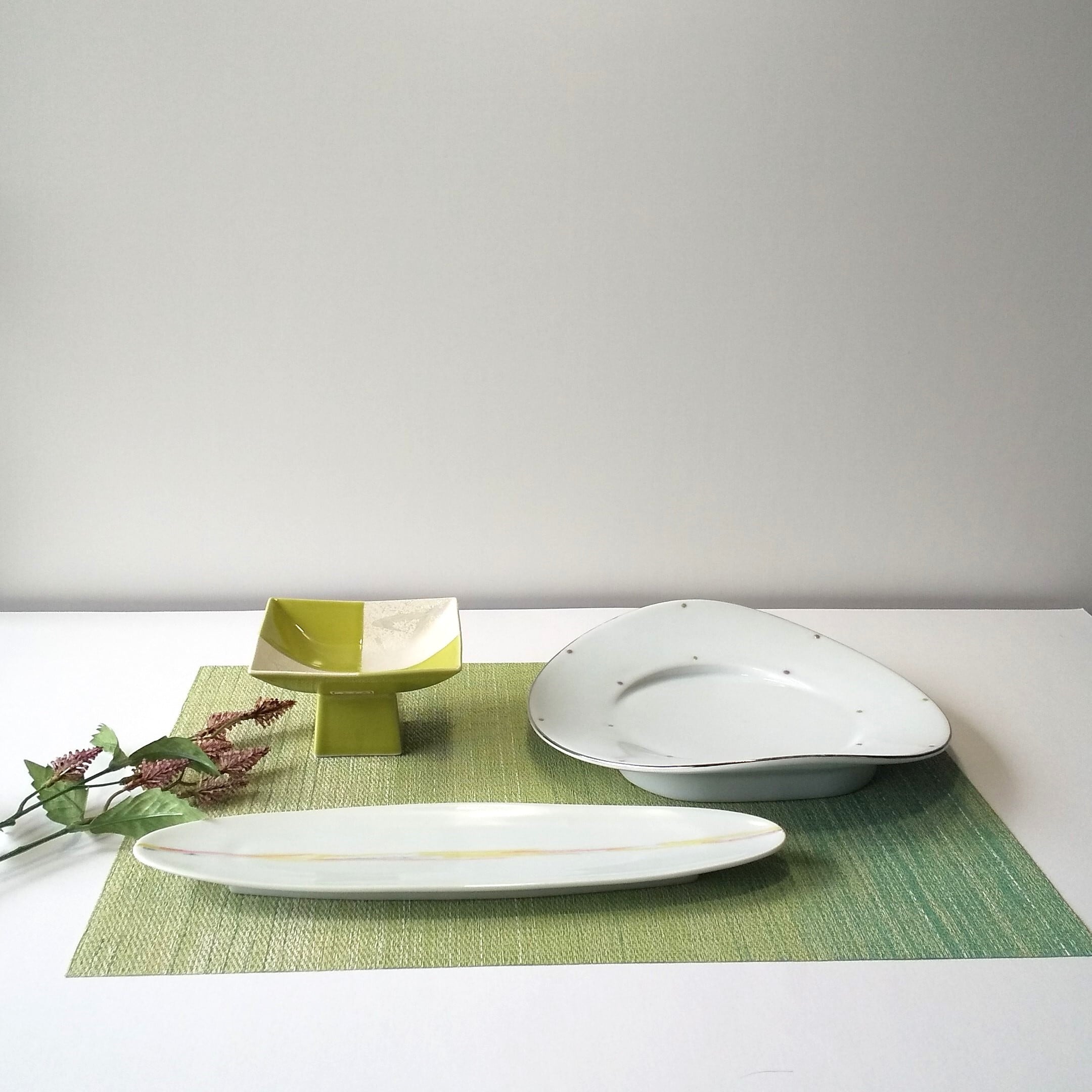 洋和洋使用できる渕プラチナ変形8寸皿 グリンラスター正角高台小鉢として使用出来ます 小判皿 前菜、三点盛等お使いいただけます