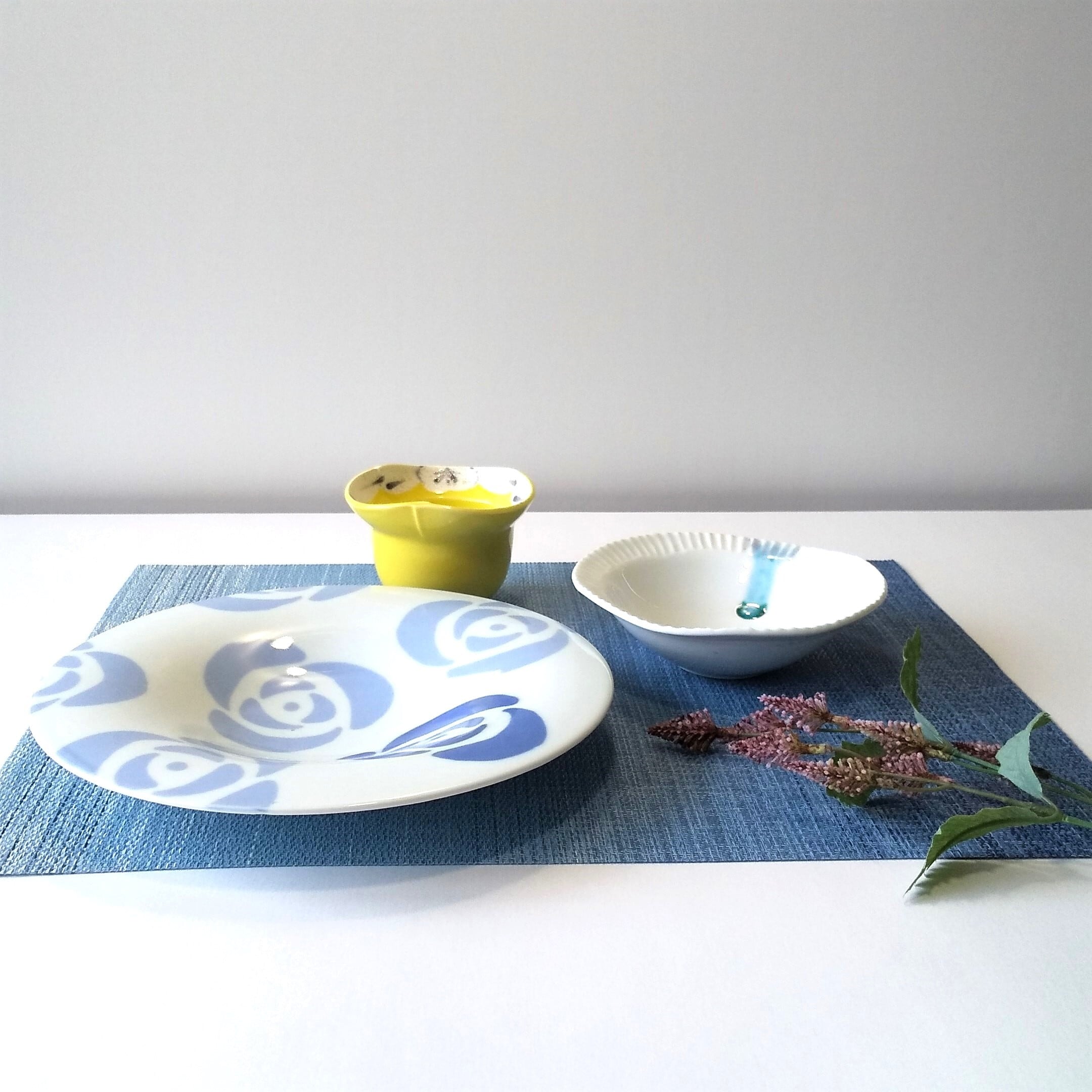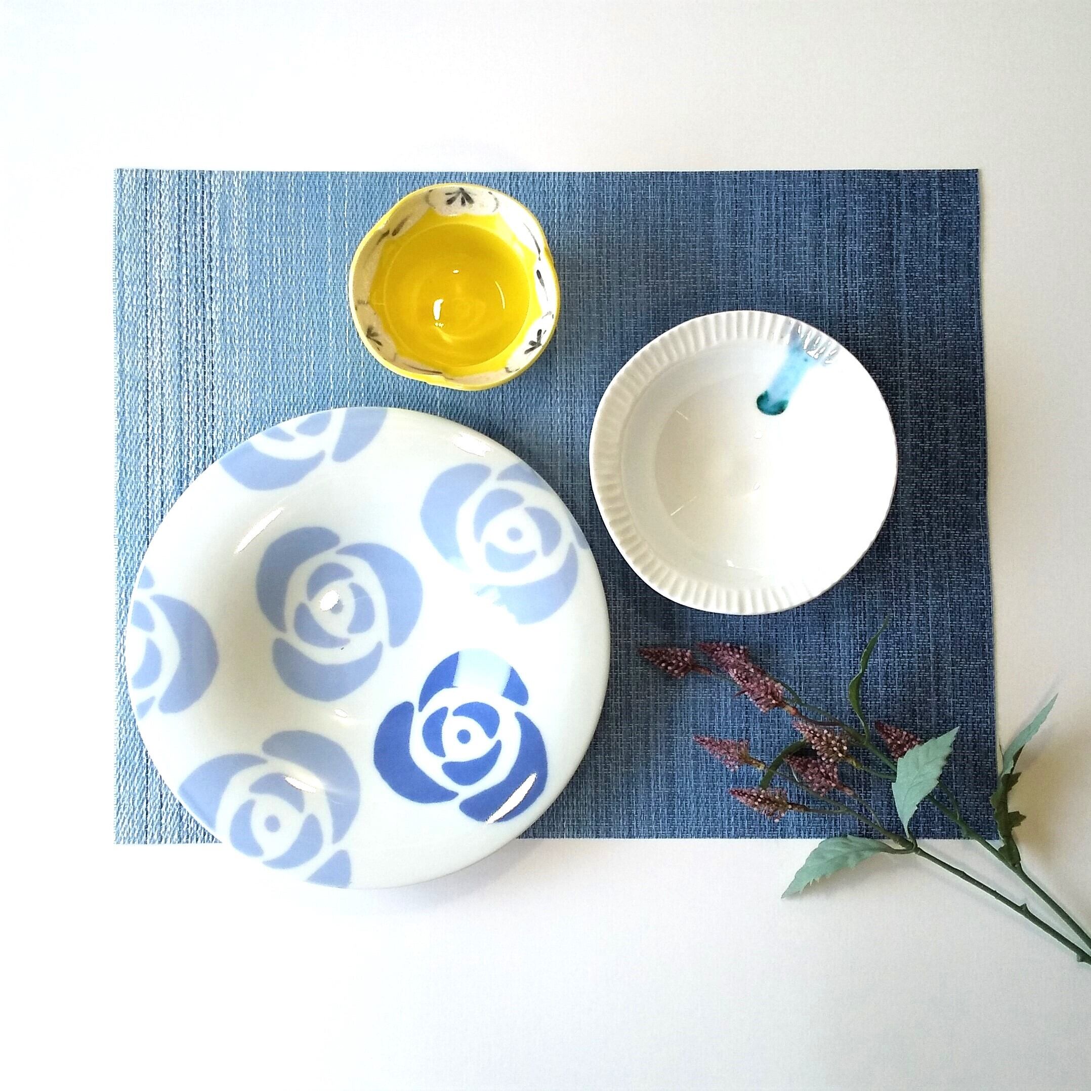 バラ絵パスタ皿 白柚彫青流しサラダ鉢 黄釉渕に小花絵小鉢