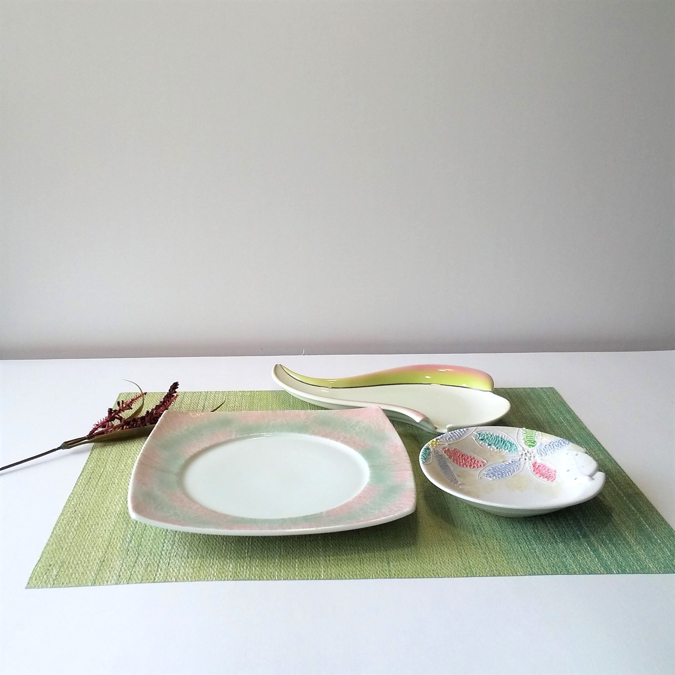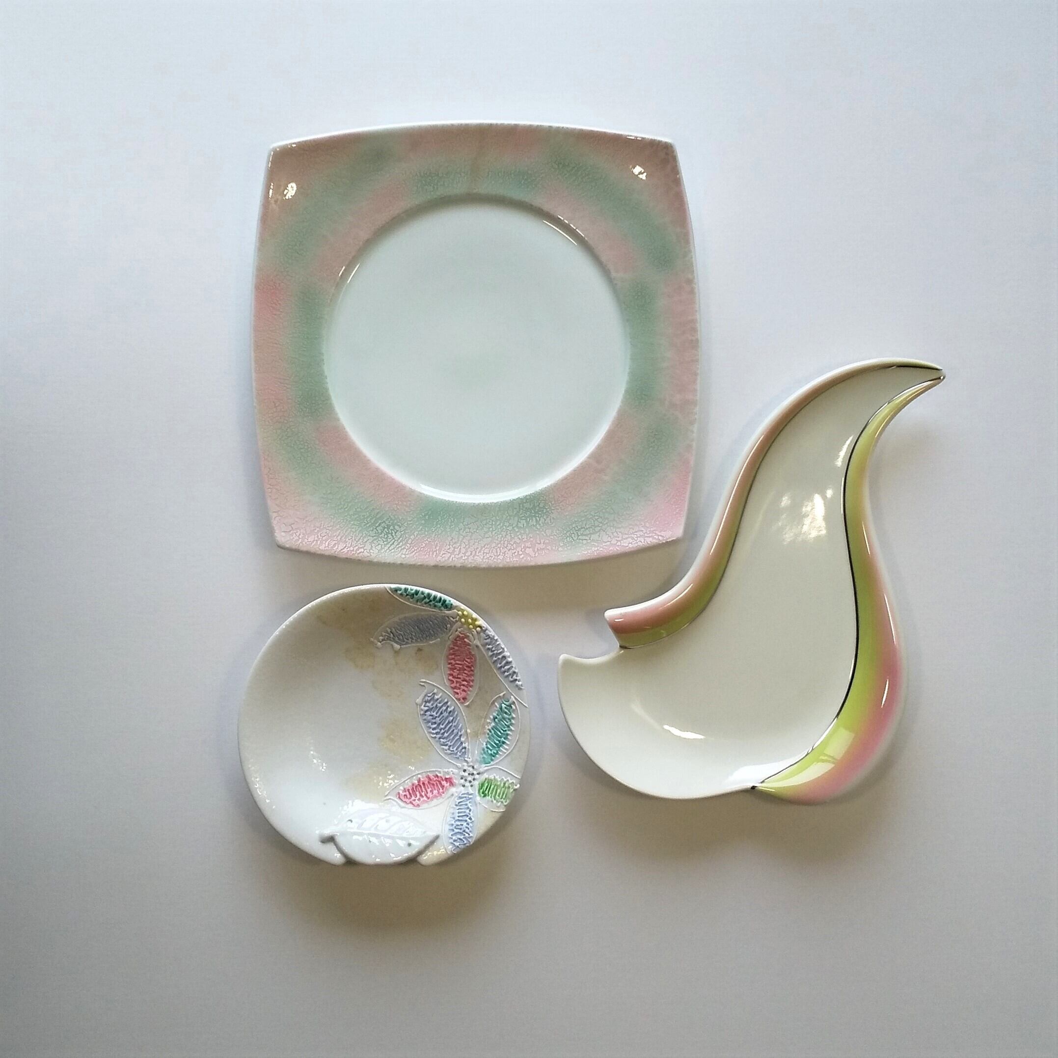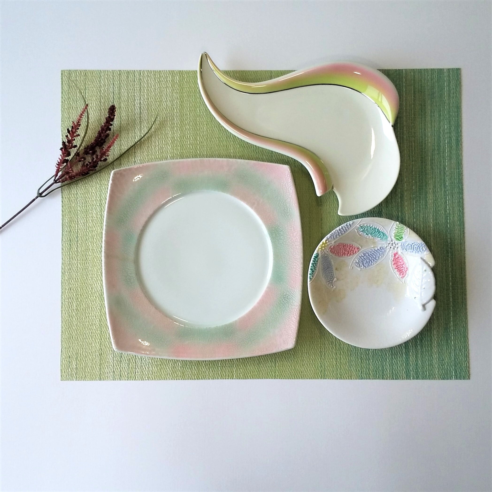 ピンクグリーン吹き和洋皿としてご使用いただけます ピンク二色吹き前菜皿 一珍花絵フルーツ、取皿等にお使いいただけます
