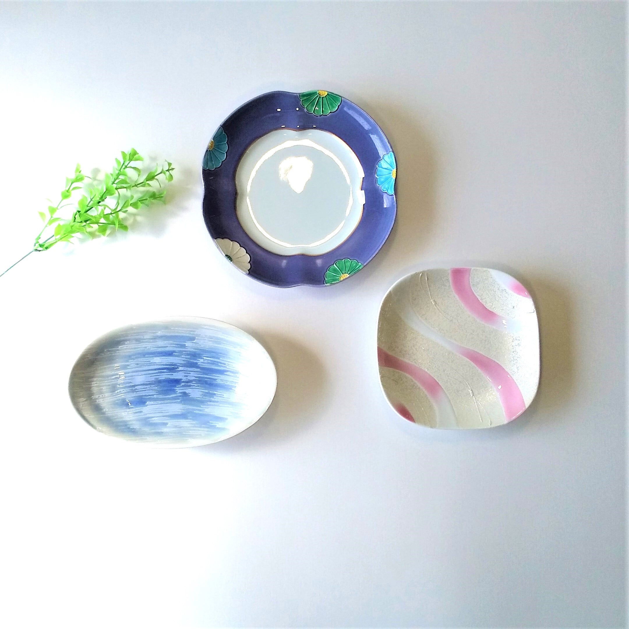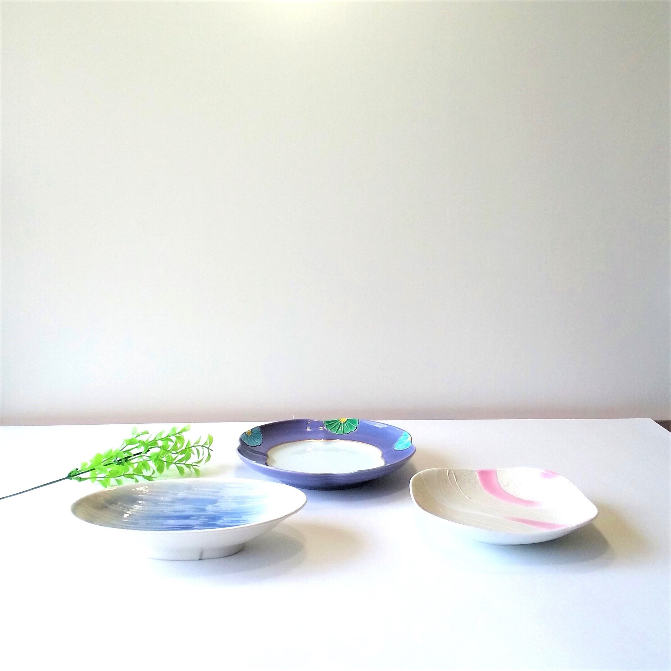 三色交趾菊フルーツ皿 一珍ピンク流水フルーツ皿 小判青白刷毛フルーツ、取皿等にお使いいただけます