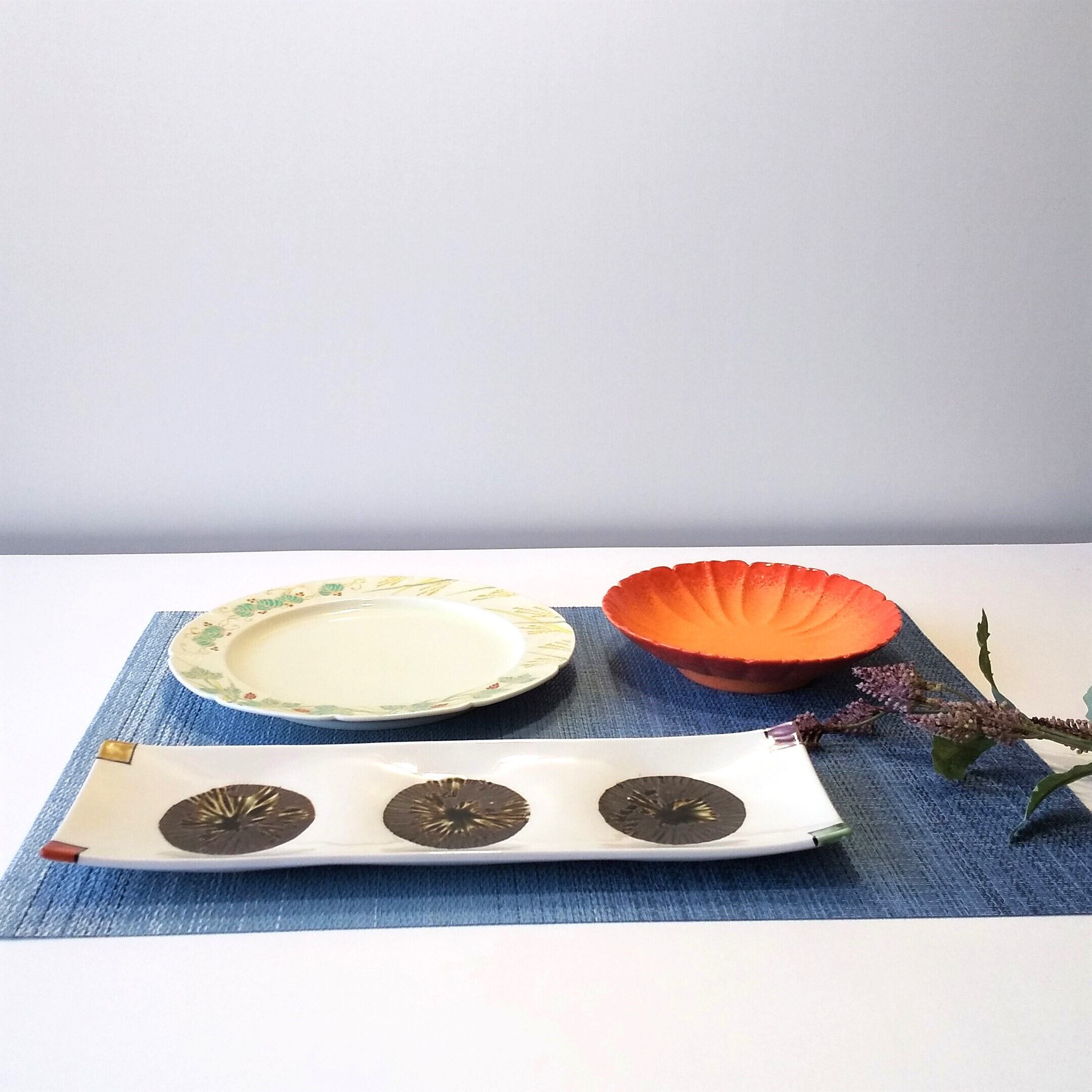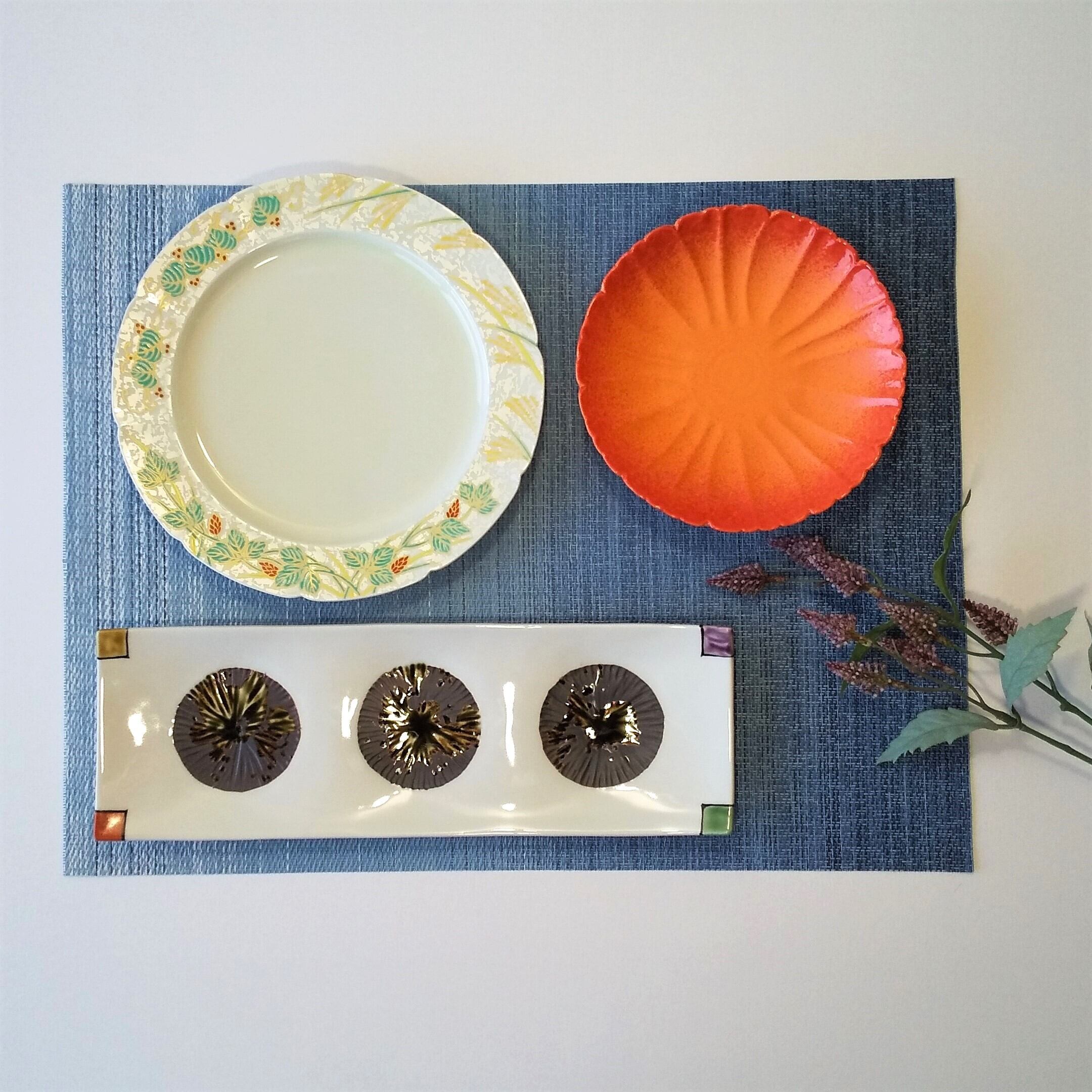 小花ラスター7寸皿、和洋使用できます、 錆三種盛、前菜皿等にお使いいただけます 朱吹付フルーツ、多用皿として使用出来ます