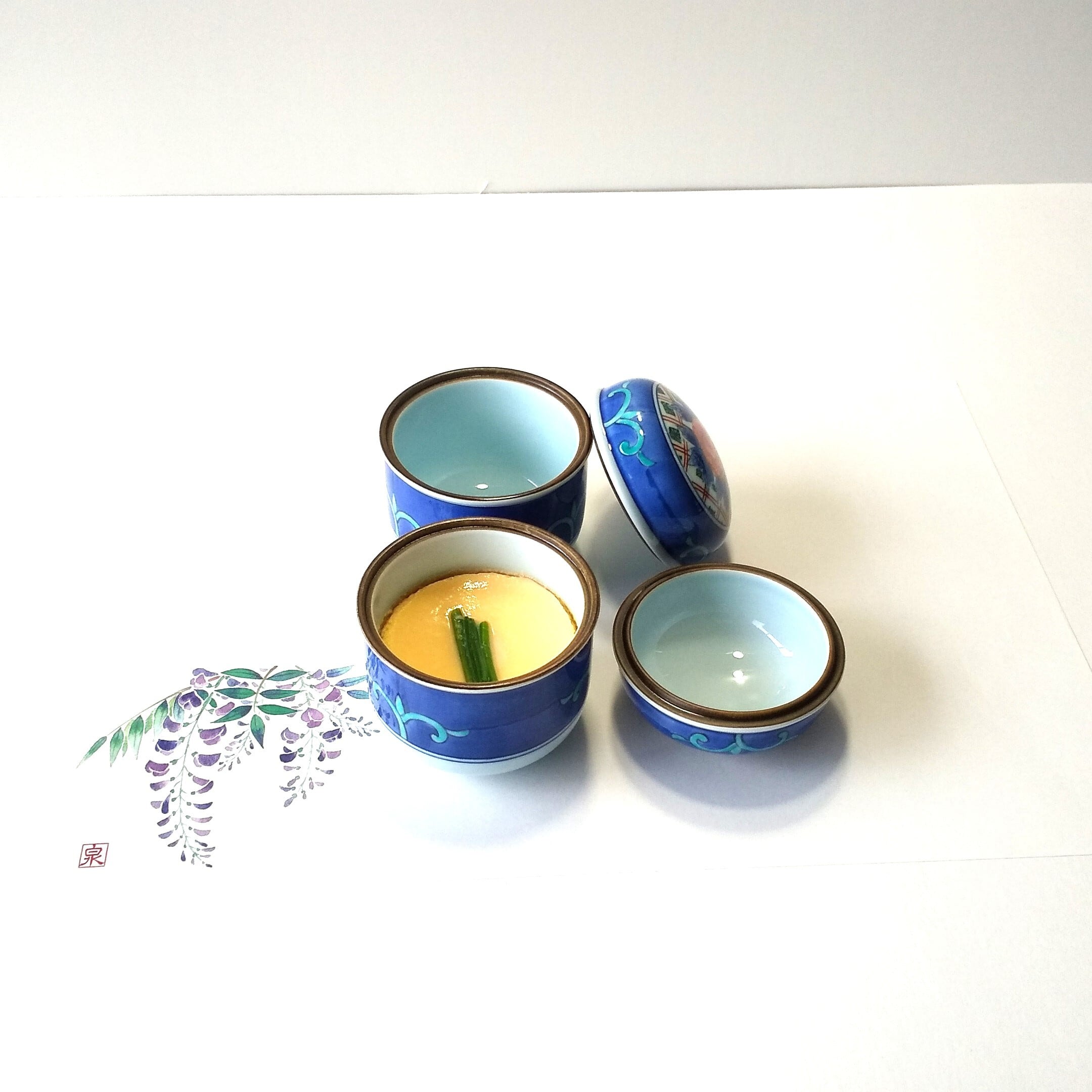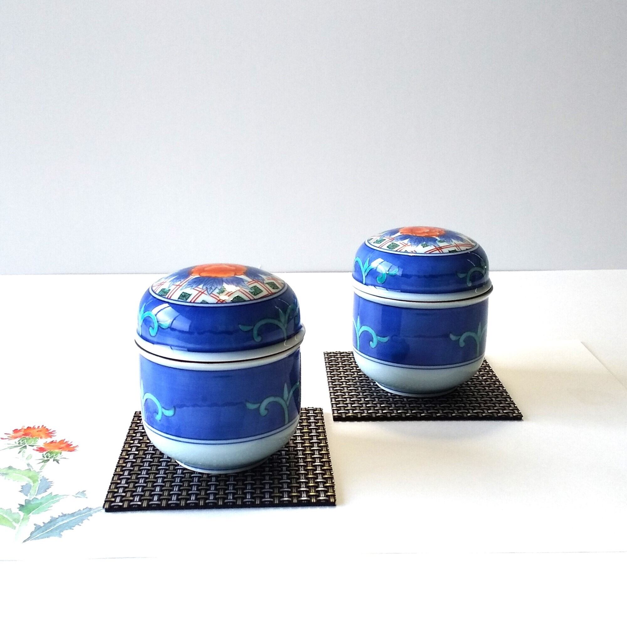 染錦牡丹絵茶碗蒸碗、有田焼の特徴的、呉須(藍色)赤濃牡丹格調高い商品です 蒸碗の身、蓋の渕に茶色(錆)を汚れないように塗つてあります 丸みのある形状の洗い易く使いやすい高級品です H9,8㎝xw8㎝