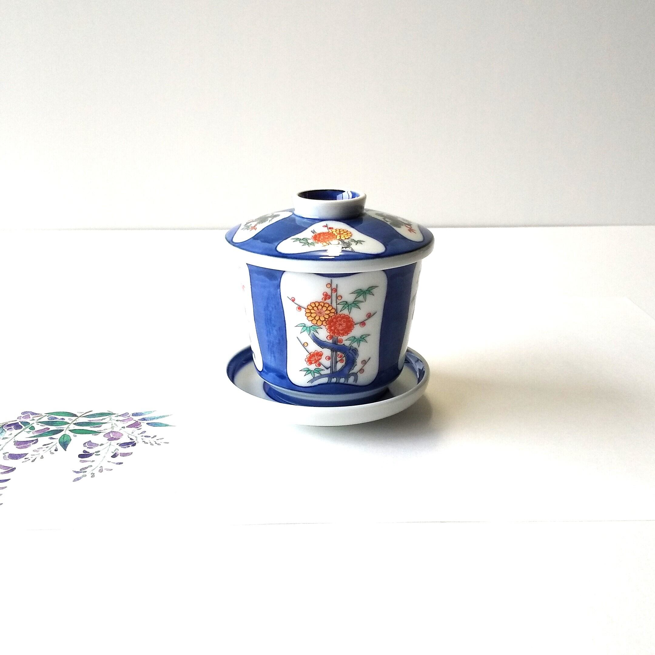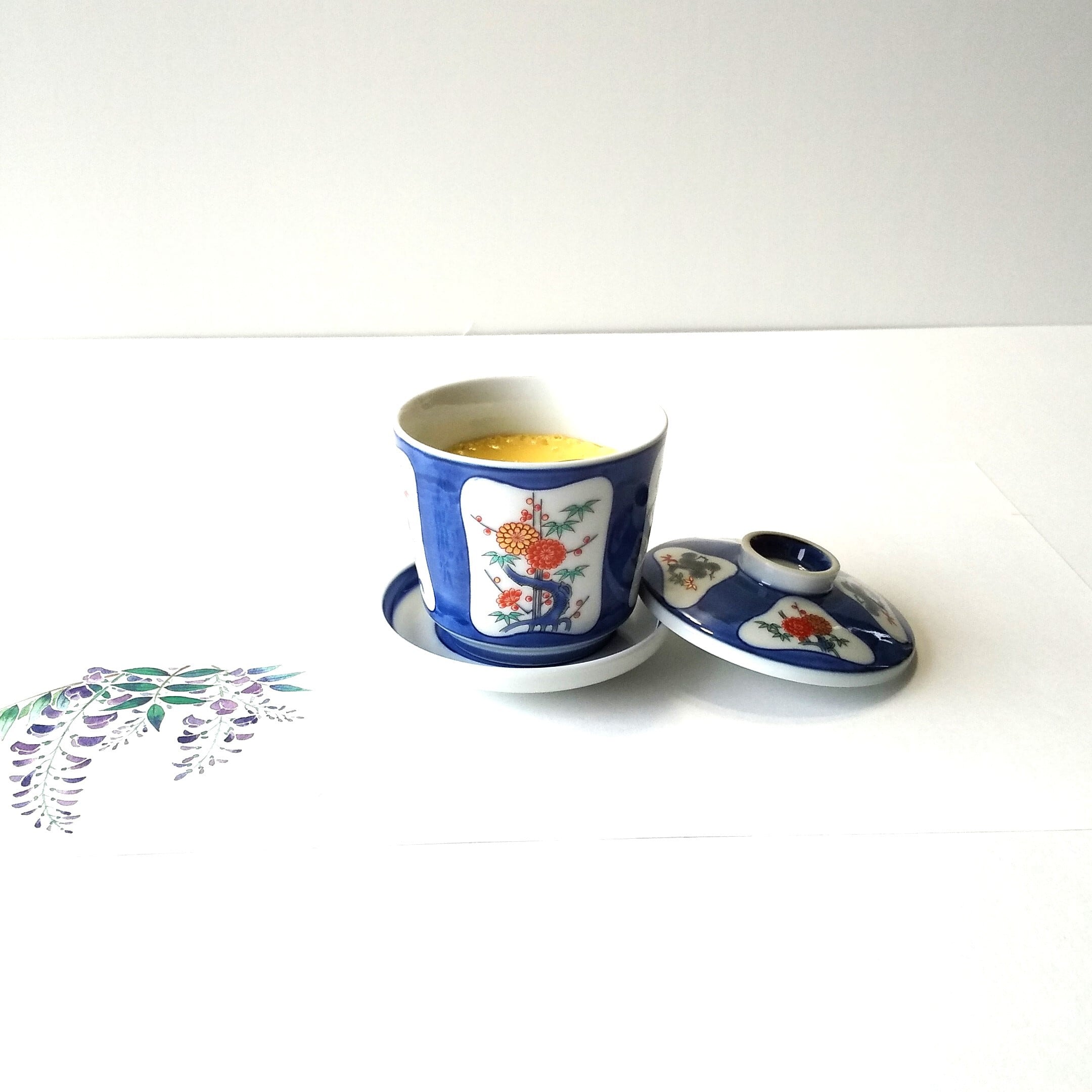 台皿付松竹梅茶碗蒸碗、容量8分目入れた状態で150ml 松竹梅の絵柄を四方に描いてあります