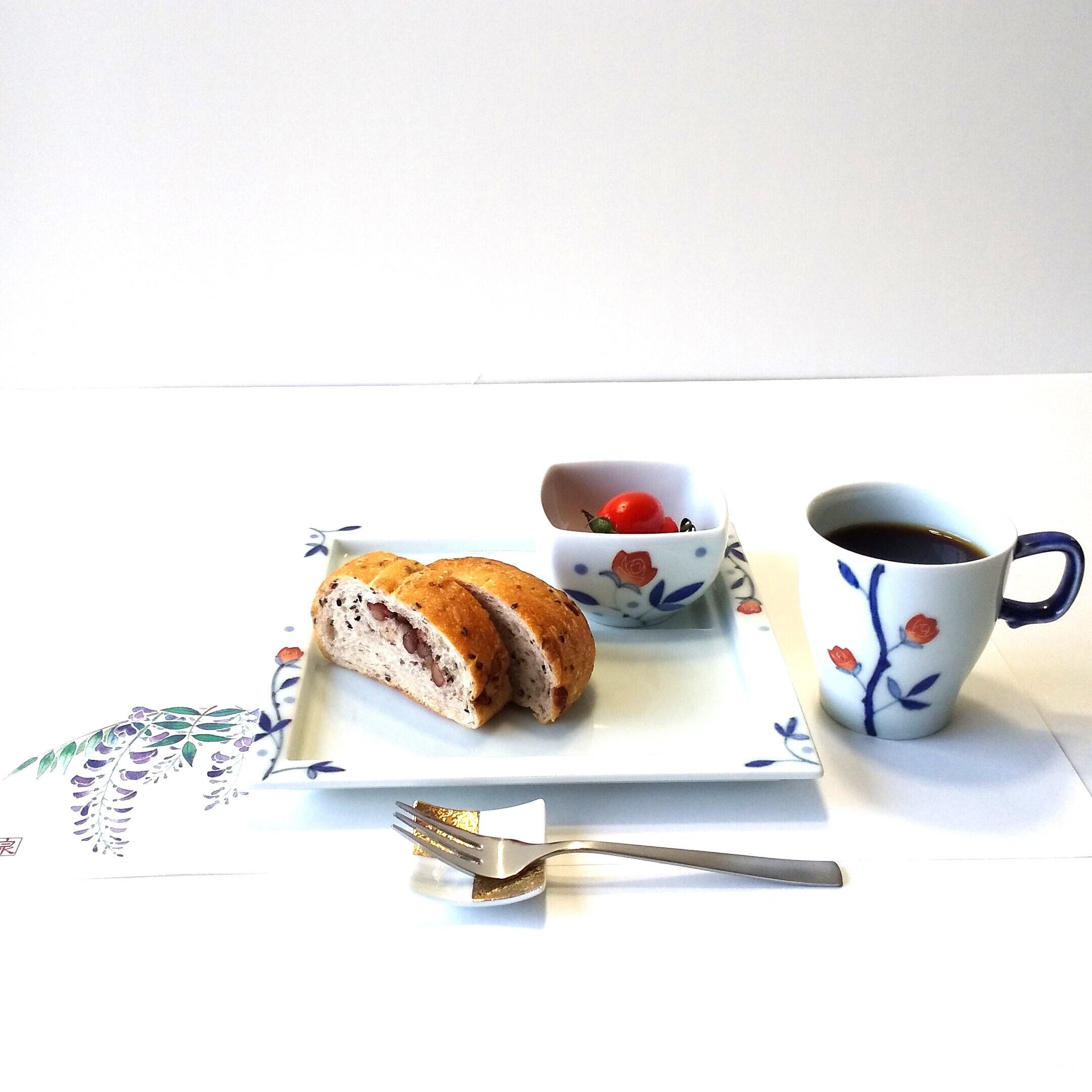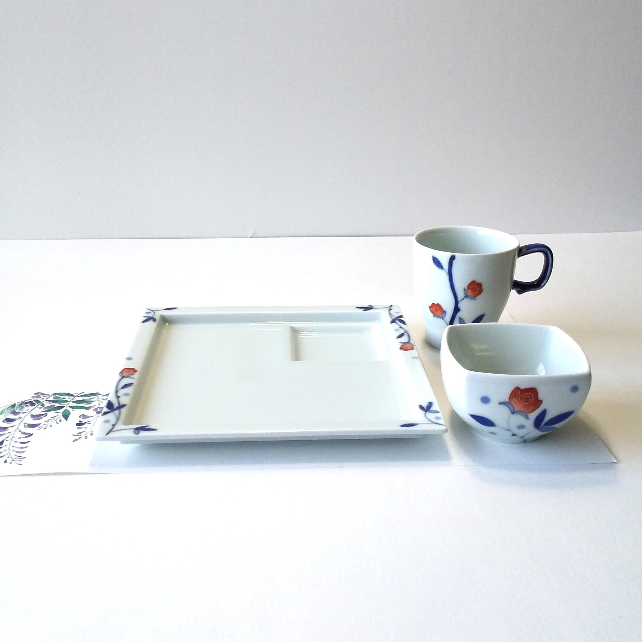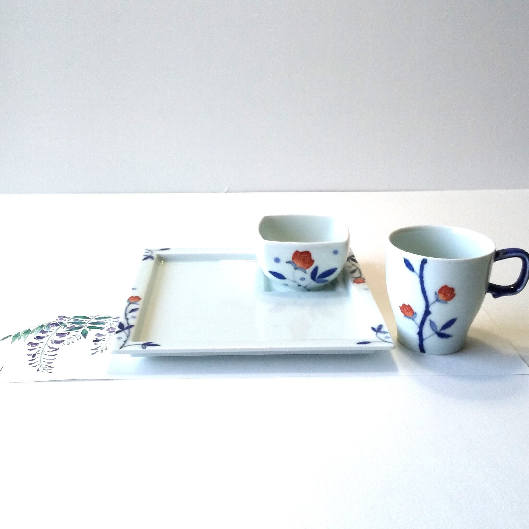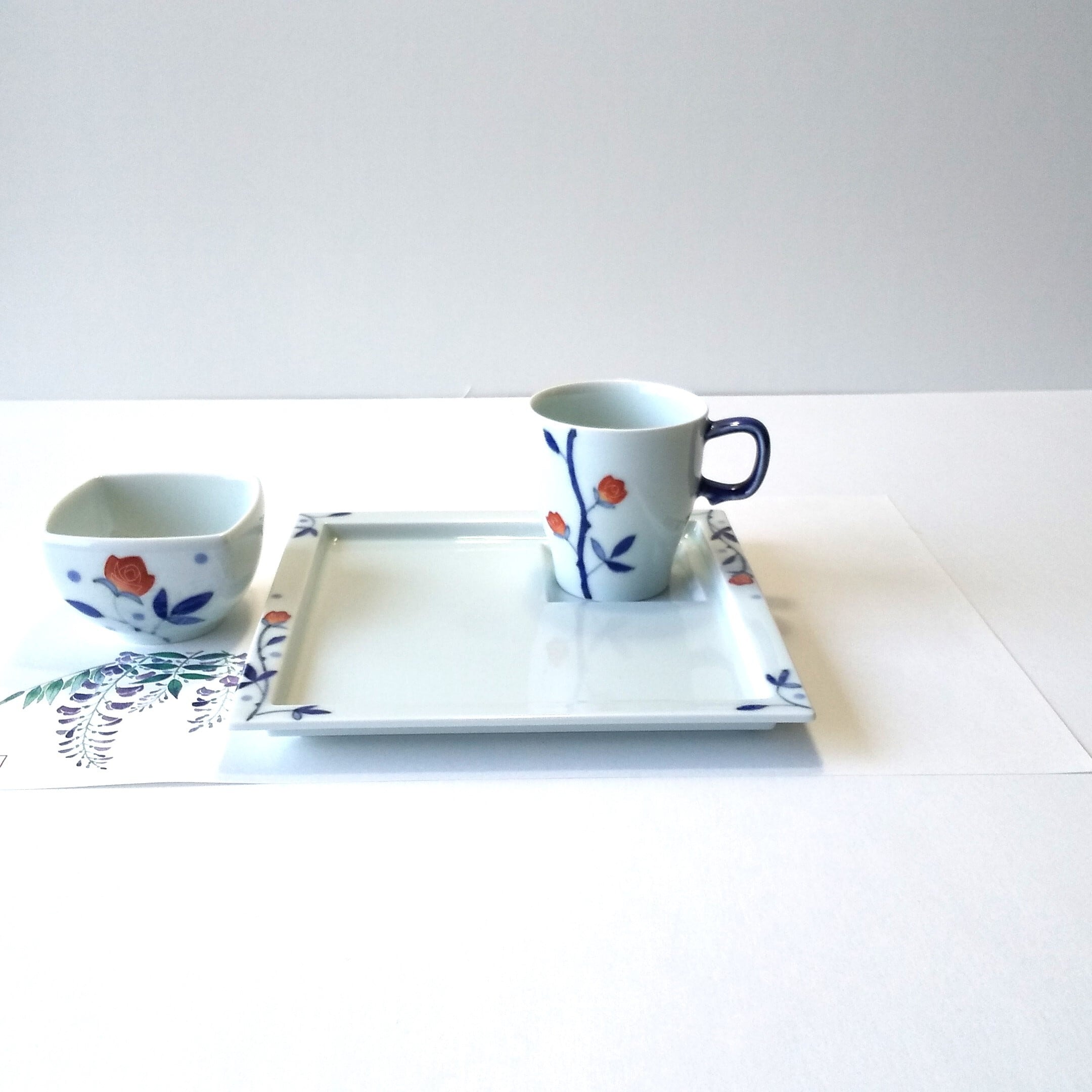 バラ正角皿w19.3㎝ コーヒー碗w7㎝xH7.7㎝。容量8分目入れた状態で120ml普通の大きさの コーヒー碗位 小鉢w7.8㎝xH5㎝
